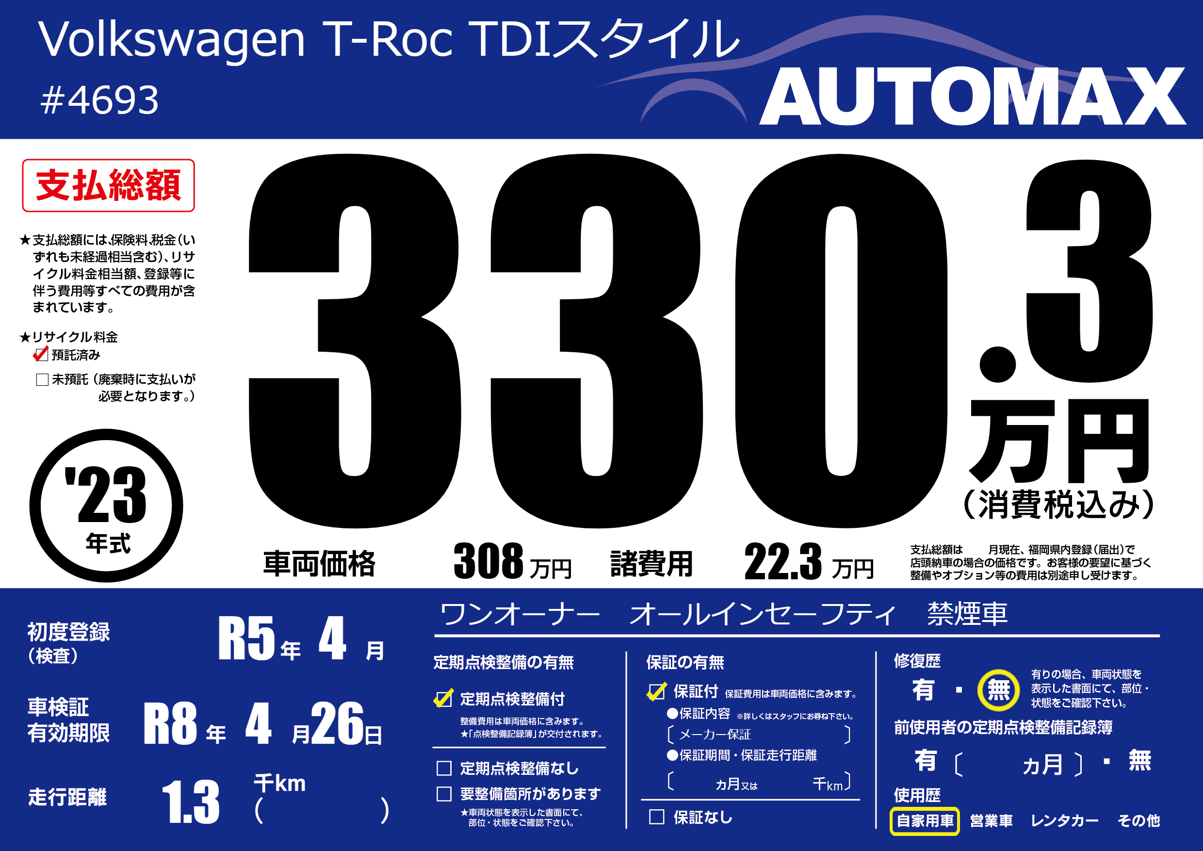 | 車名 | Volkswagen T-Roc TDIスタイル | グレード ミッション 排気量 |
