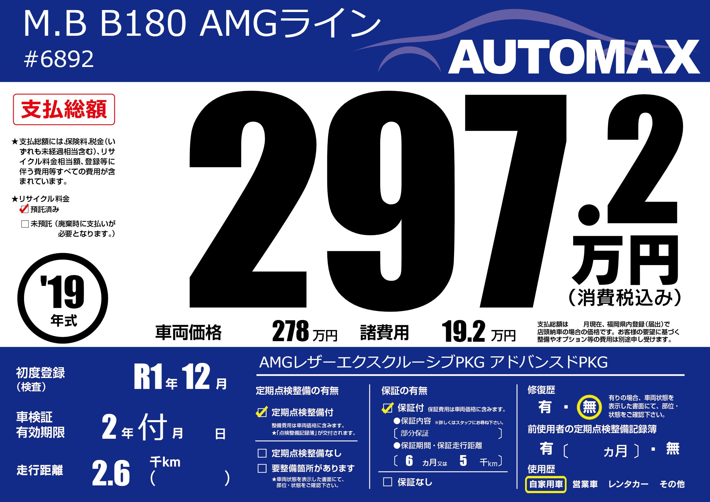 | 車名 | M.B B180 AMGライン | グレード ミッション 排気量 |