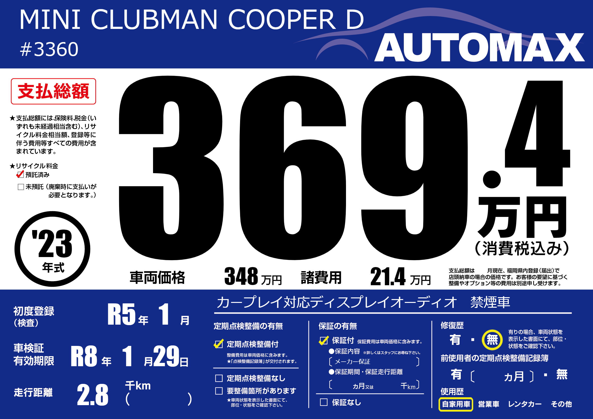 | 車名 | MINI CLUBMAN COOPER D | グレード ミッション 排気量 |