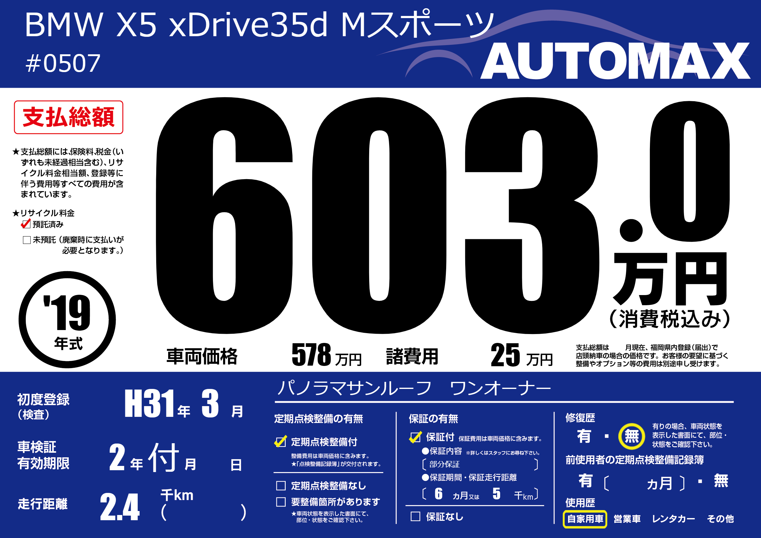 | 車名 | BMW X5 xDrive35d Mスポーツ | グレード ミッション 排気量 |