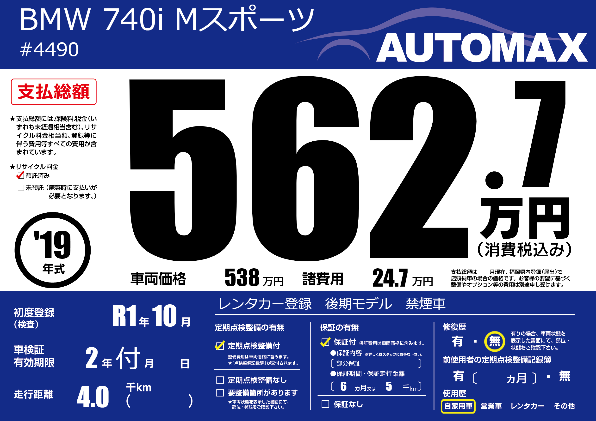 | 車名 | BMW 740i Mスポーツ | グレード ミッション 排気量 |