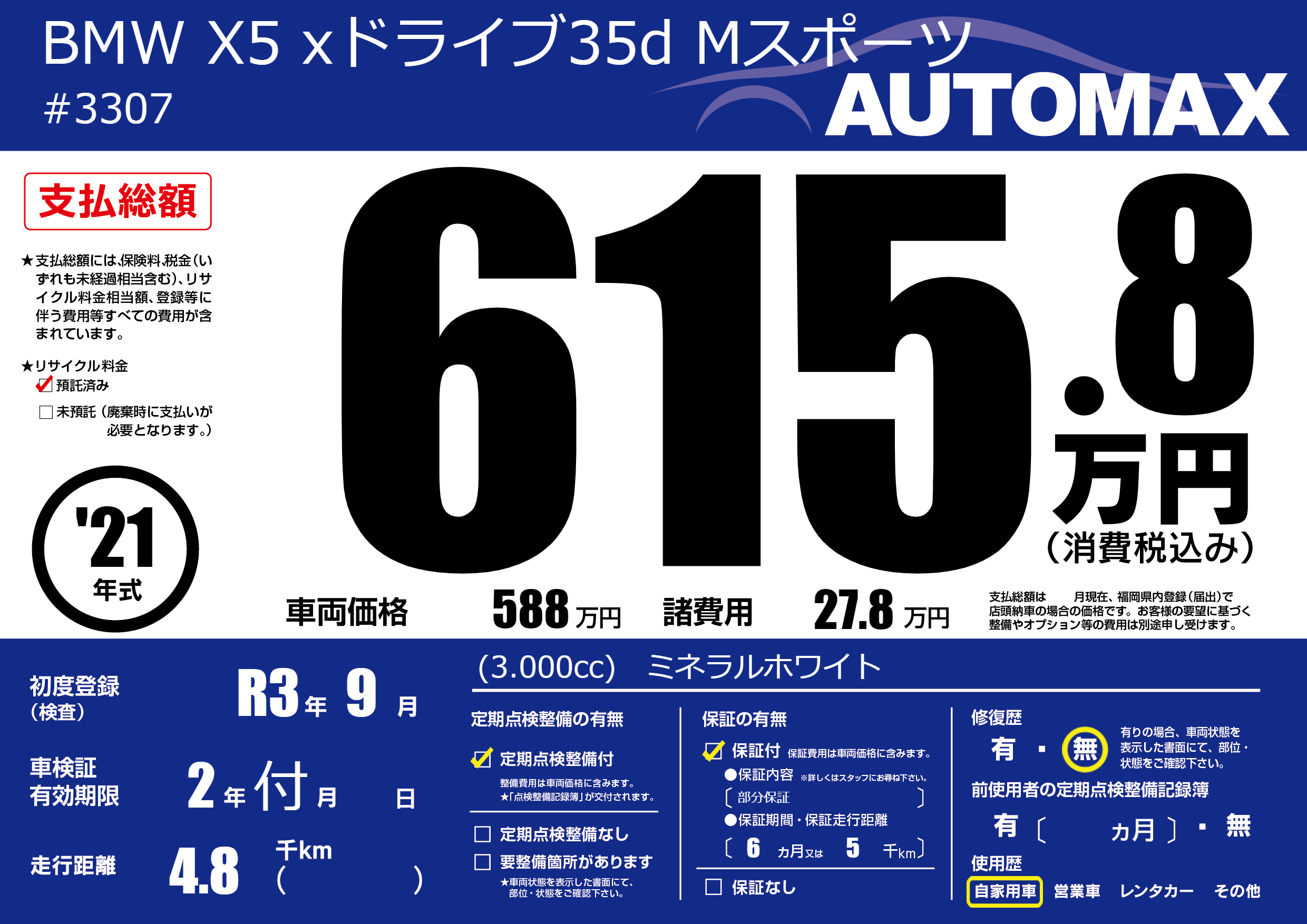 | 車名 | BMW X5 xドライブ35d Mスポーツ | グレード ミッション 排気量 |