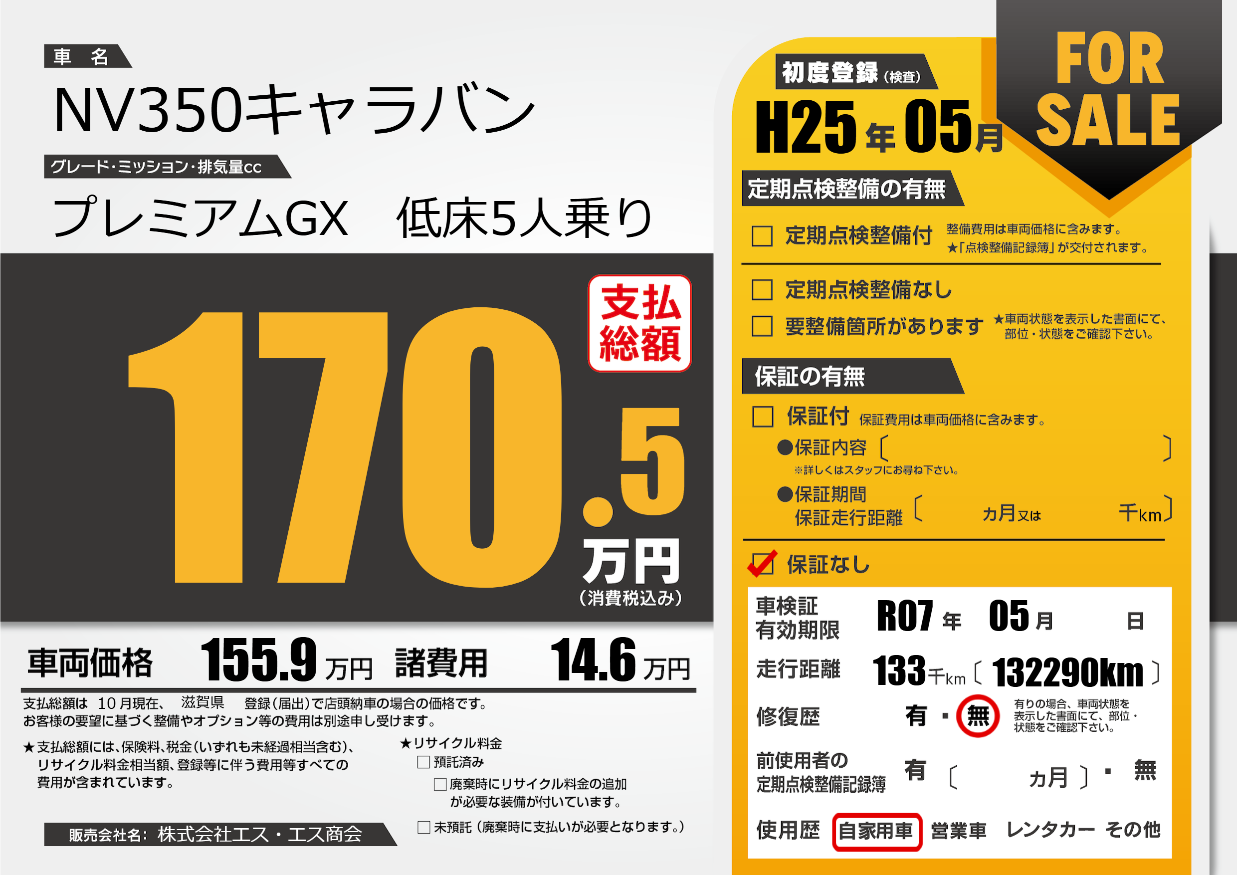 | 車名 | NV350キャラバン | グレード ミッション 排気量 |