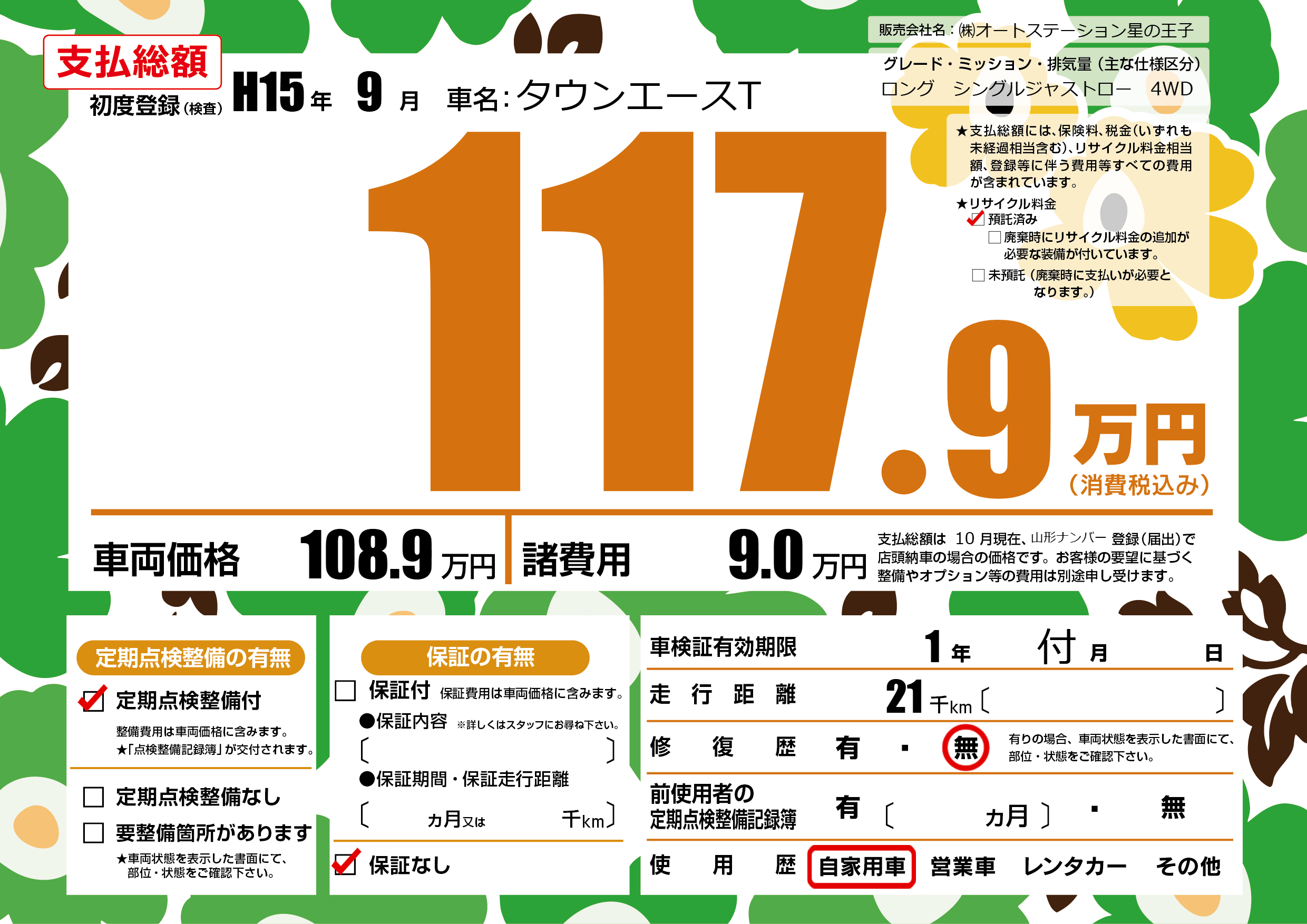 | 車名 | タウンエースT | グレード ミッション 排気量 |