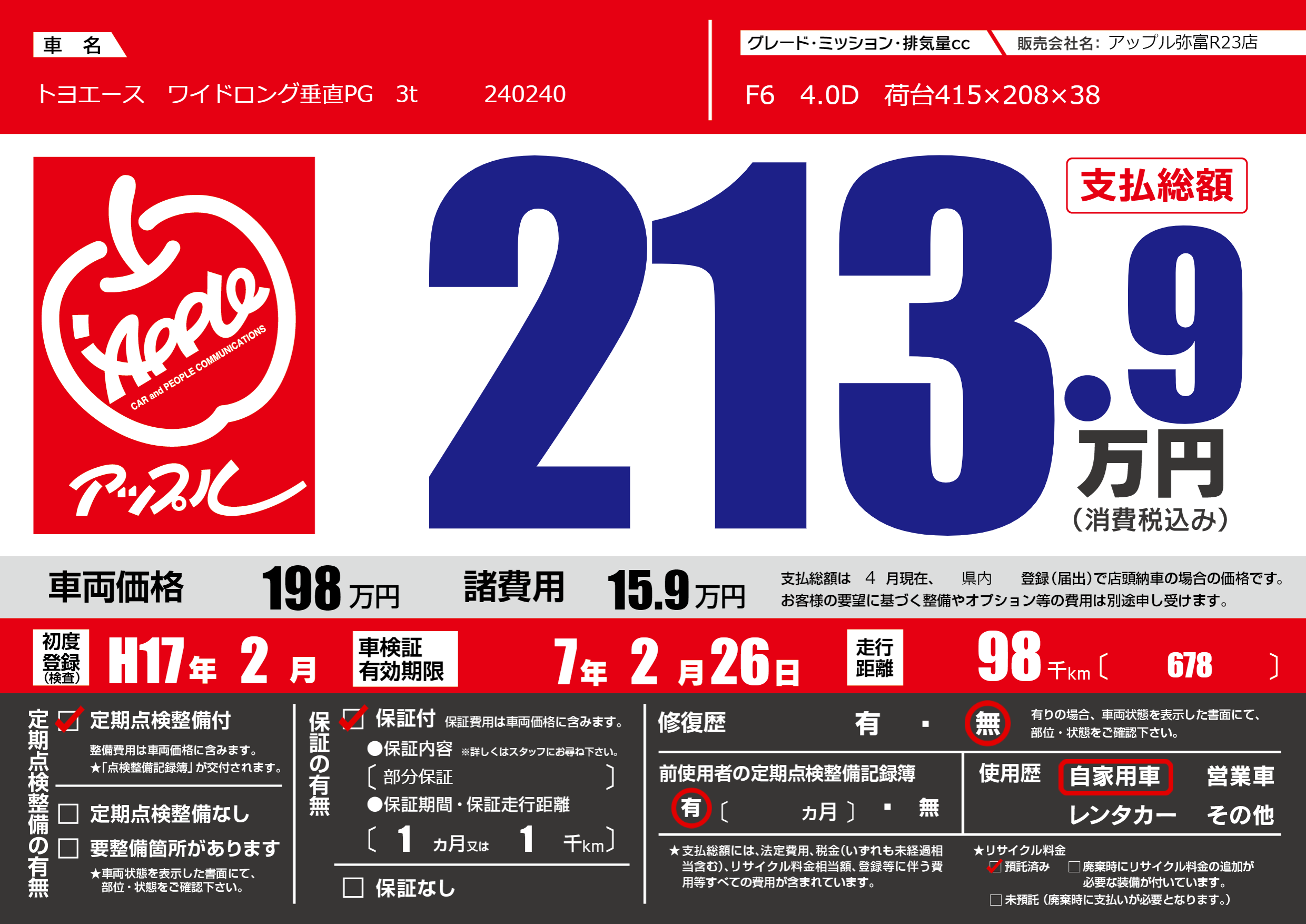 | 走行キロ | 9.8万km | 初年度登録 | H17年2月 |