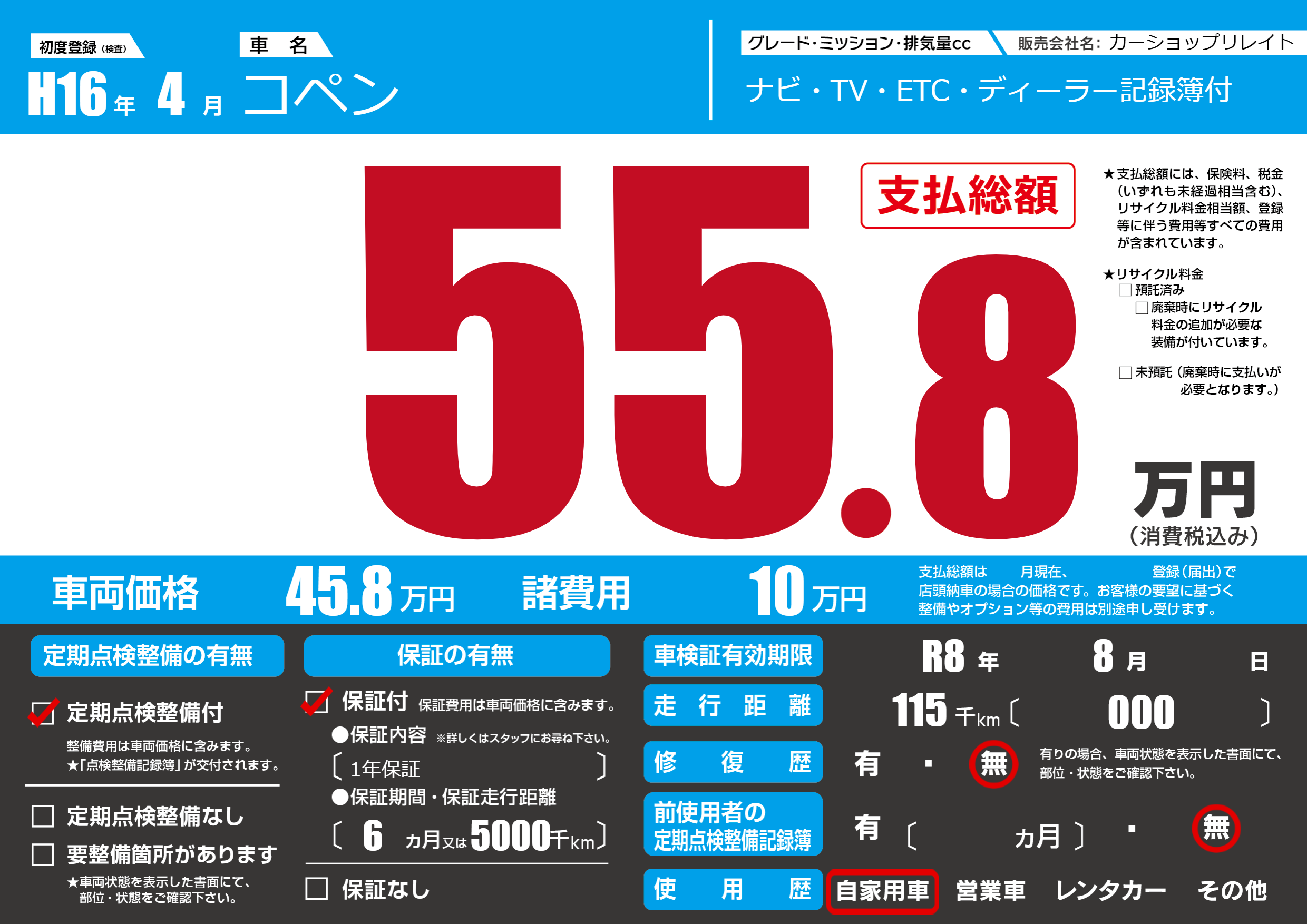 | 車検制限 | R8年 8月 - 日 | ||