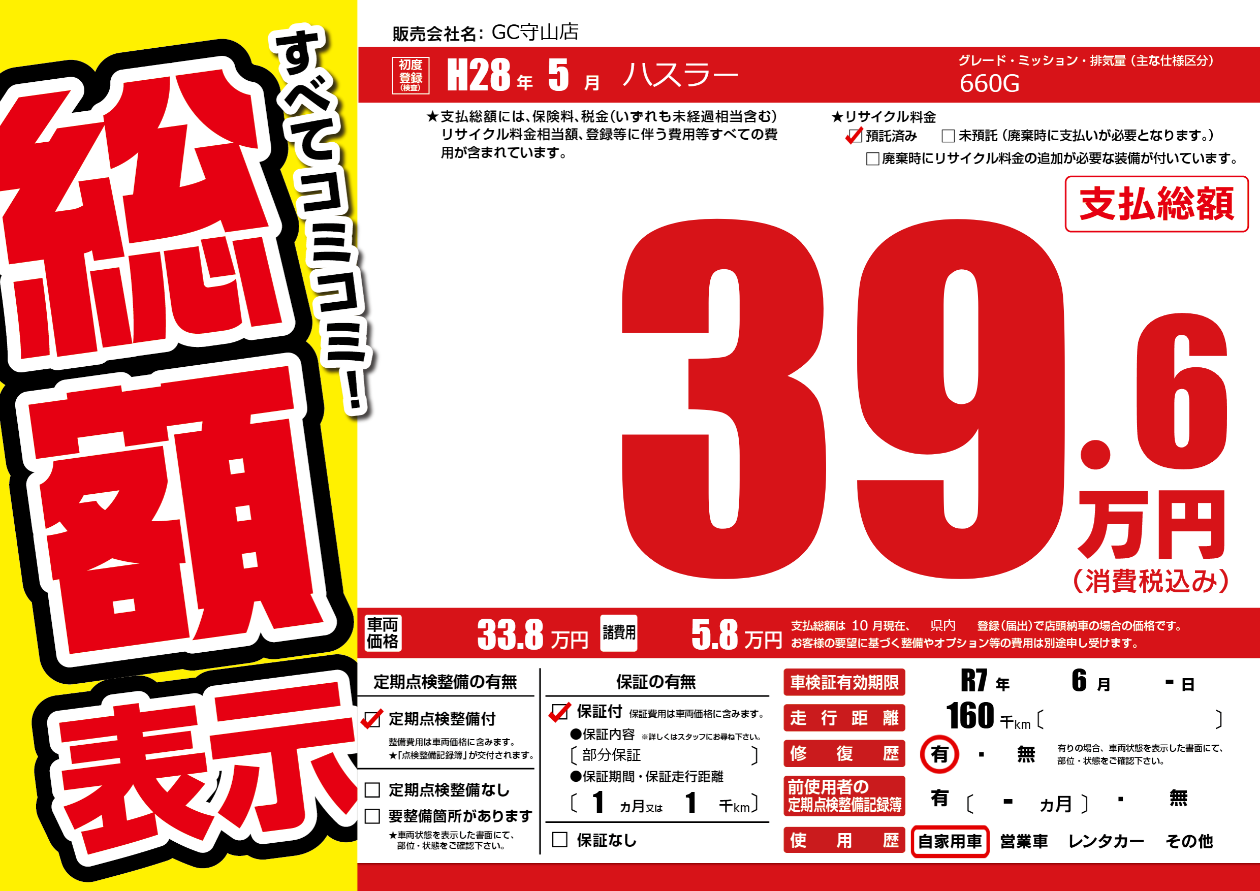 | 車名 | ハスラー | グレード ミッション 排気量 |