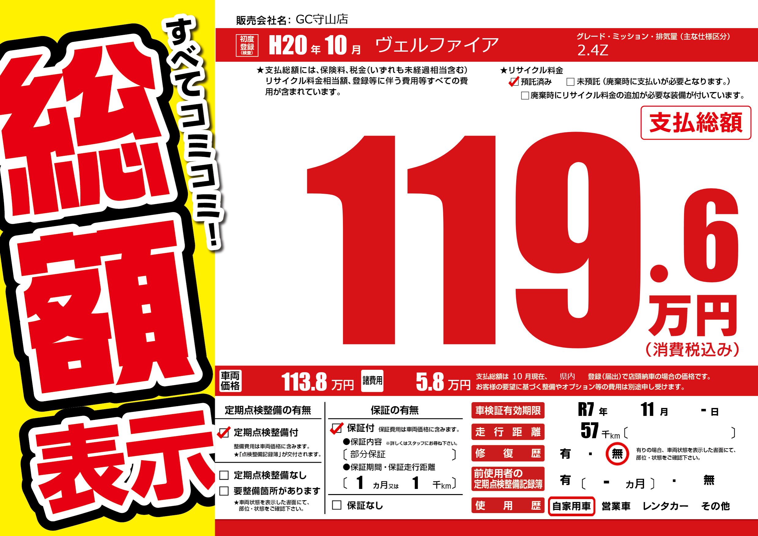 | 車名 | ヴェルファイア | グレード ミッション 排気量 |