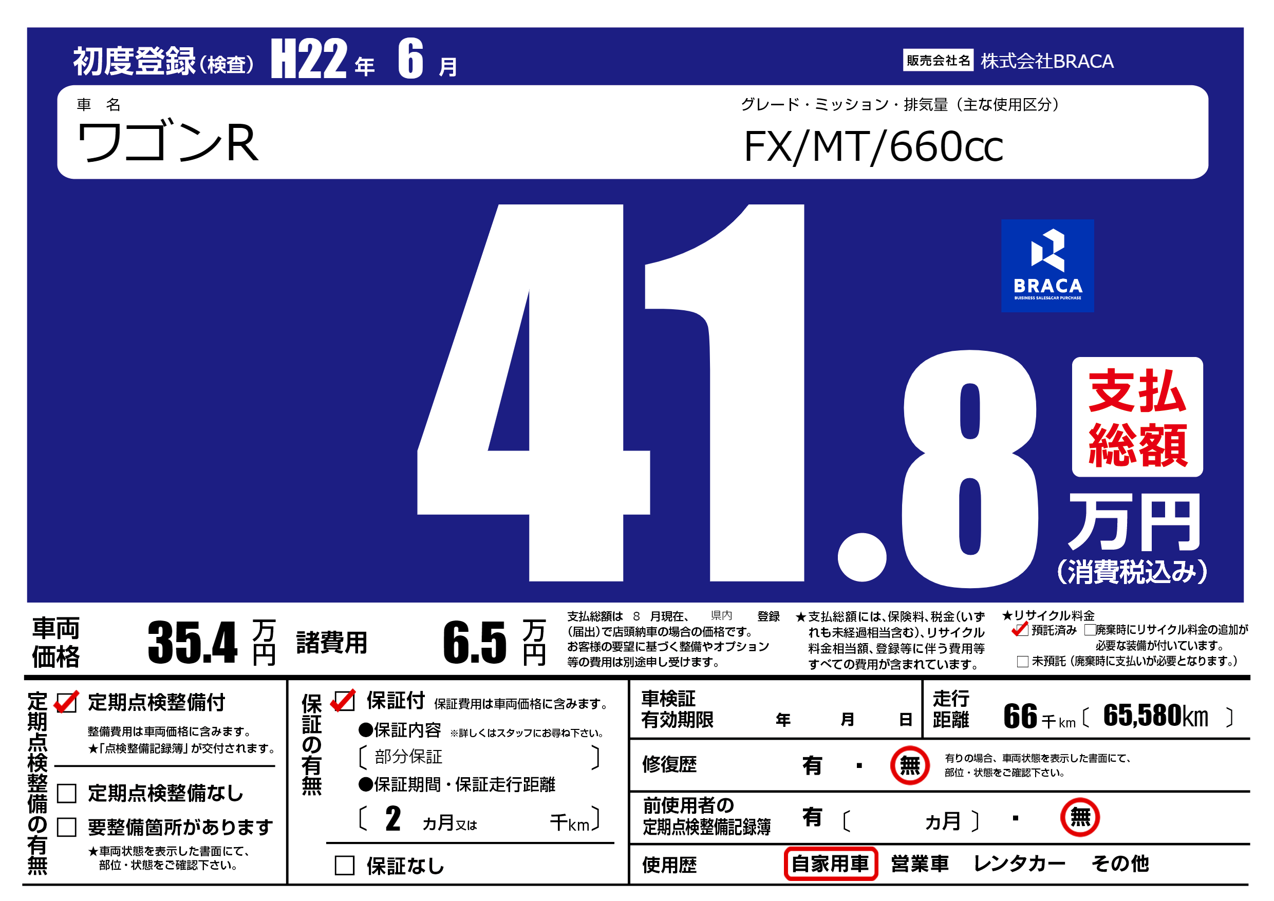 | 走行キロ | 6.6万km | 初年度登録 | H22年6月 |