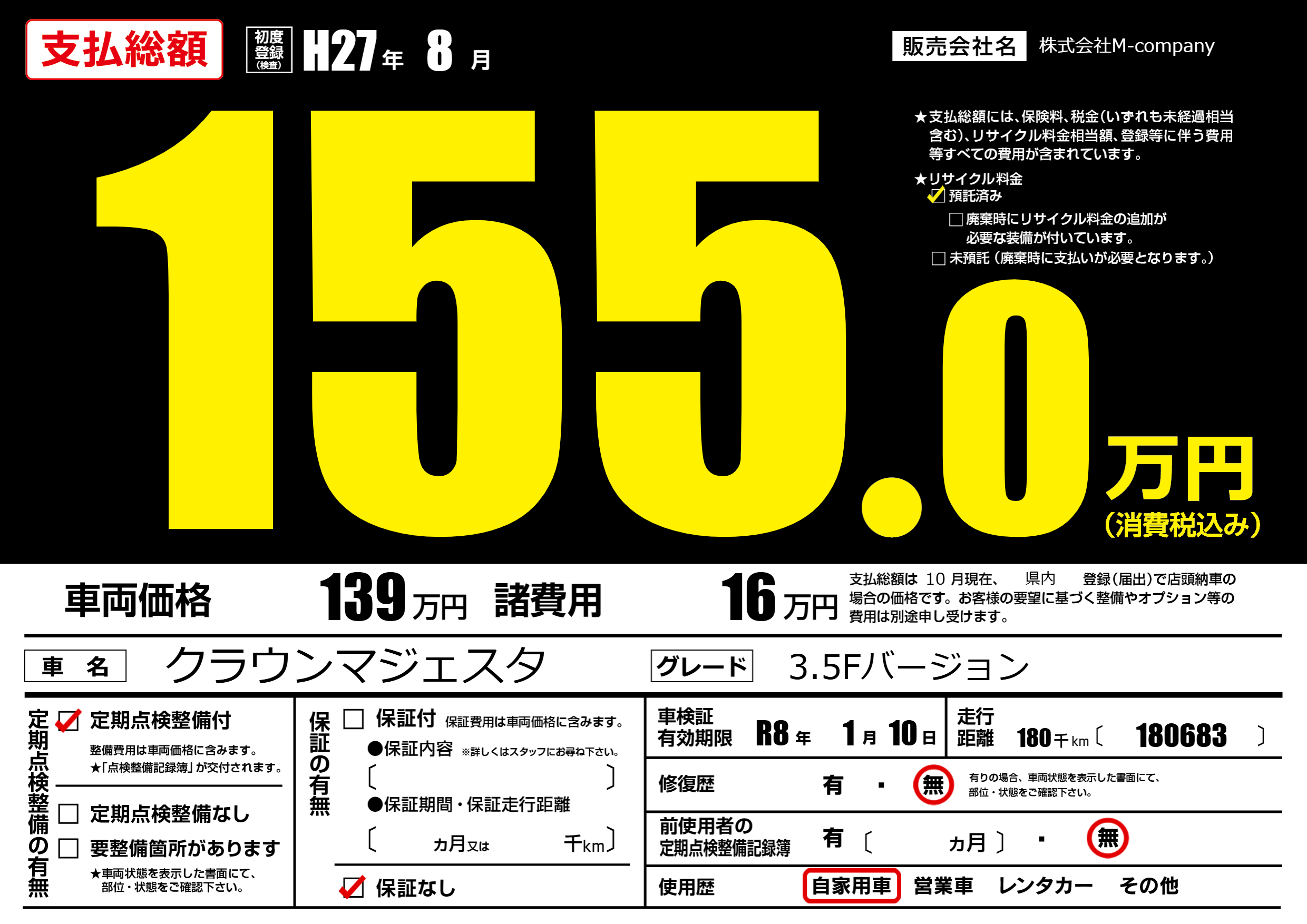 | 車名 | クラウンマジェスタ | グレード ミッション 排気量 |