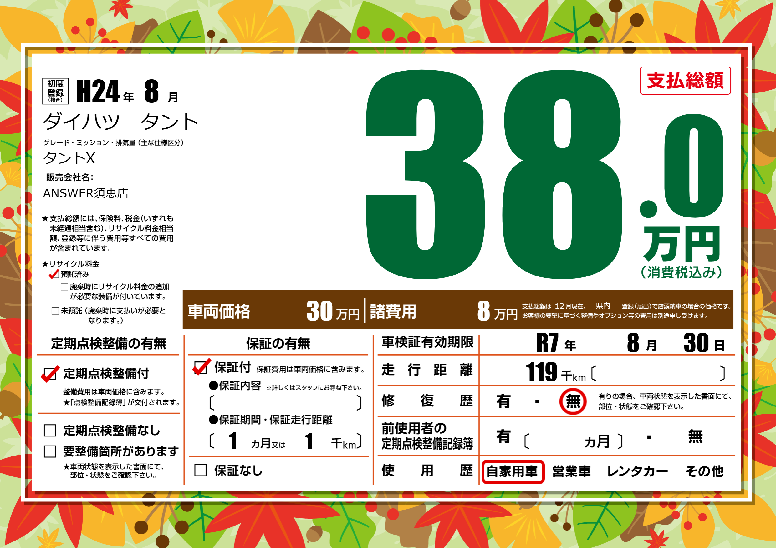 | 車名 | ダイハツ タント | グレード ミッション 排気量 |