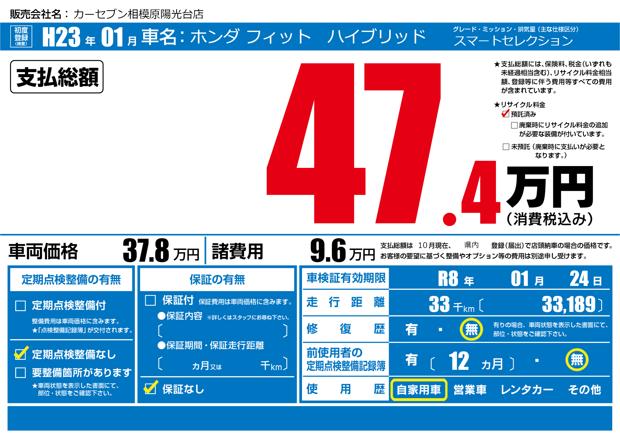 | 車名 | ホンダ フィット ハイブリッド | グレード ミッション 排気量 |