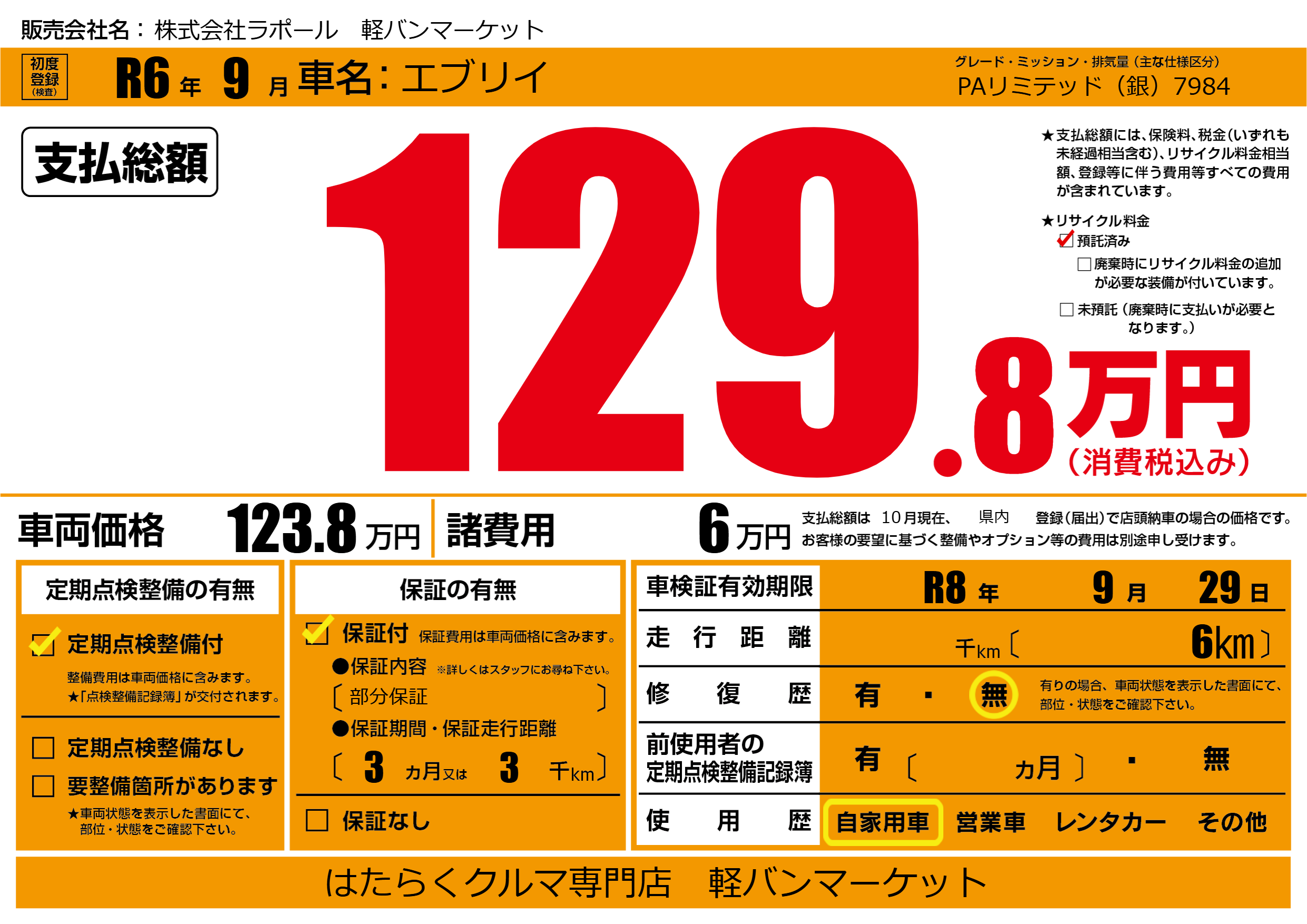 なし | 車検制限 | R8年9月29月 |