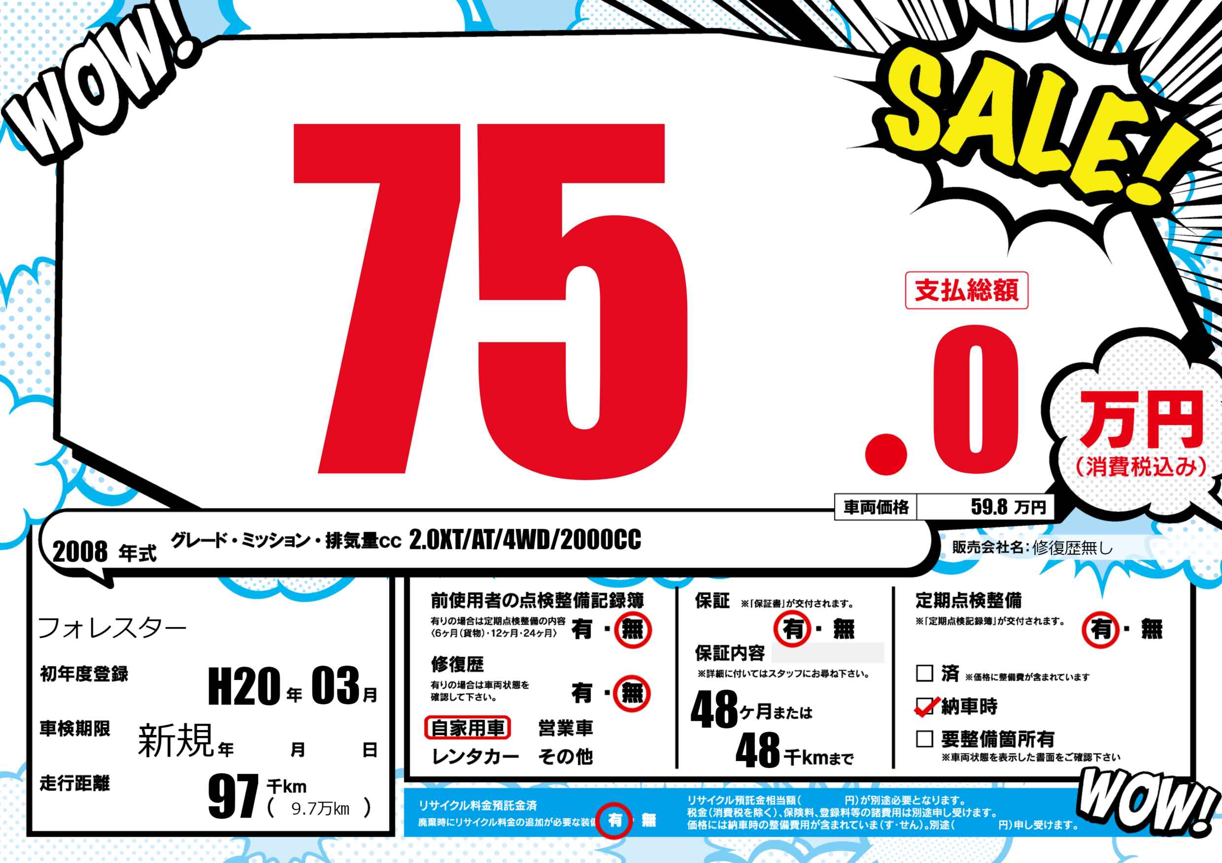| 走行キロ | 9.7万km | 初年度登録 | H20年03月 |