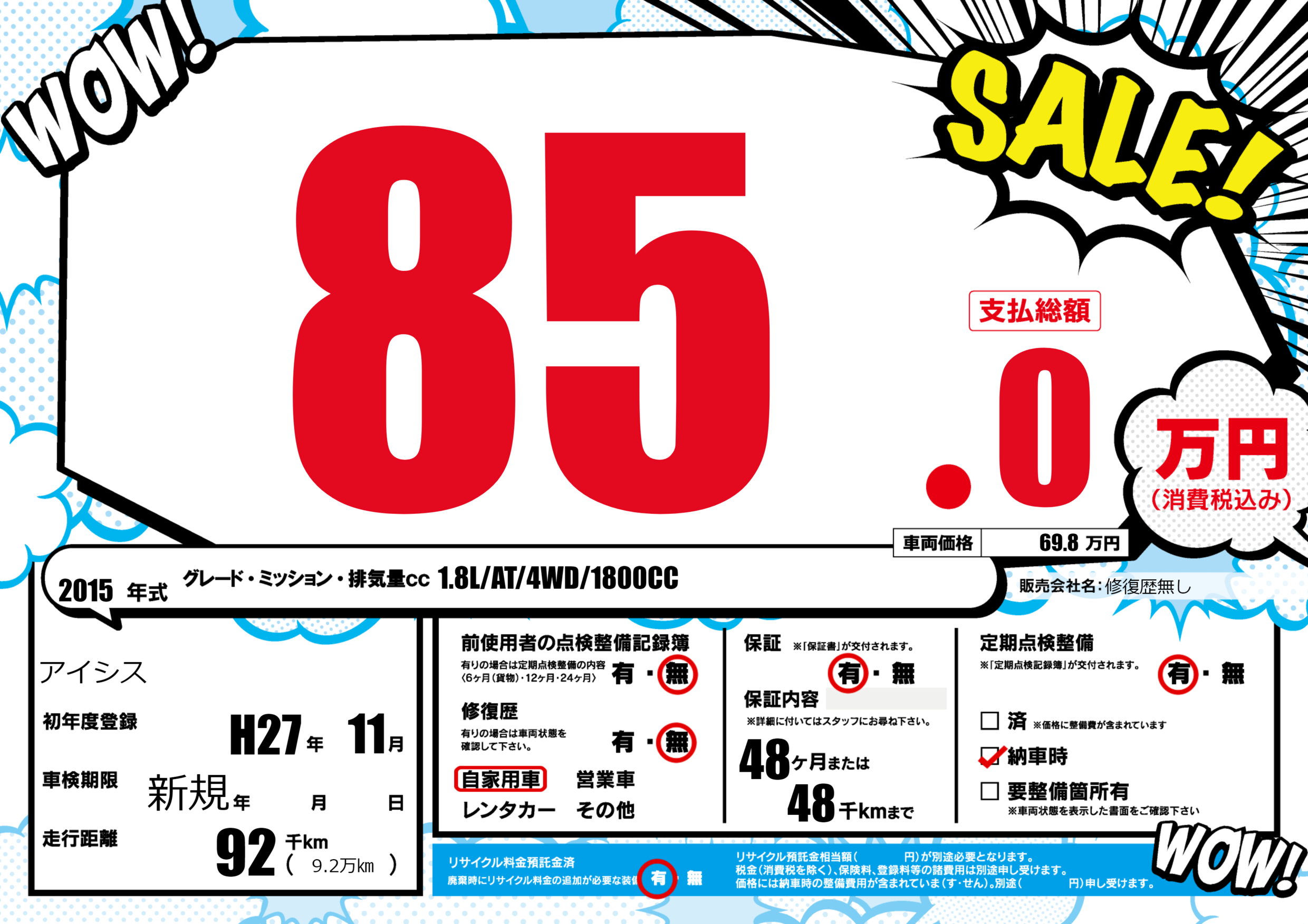 | 走行キロ | 9.2万km | 初年度登録 | H27年11月 |