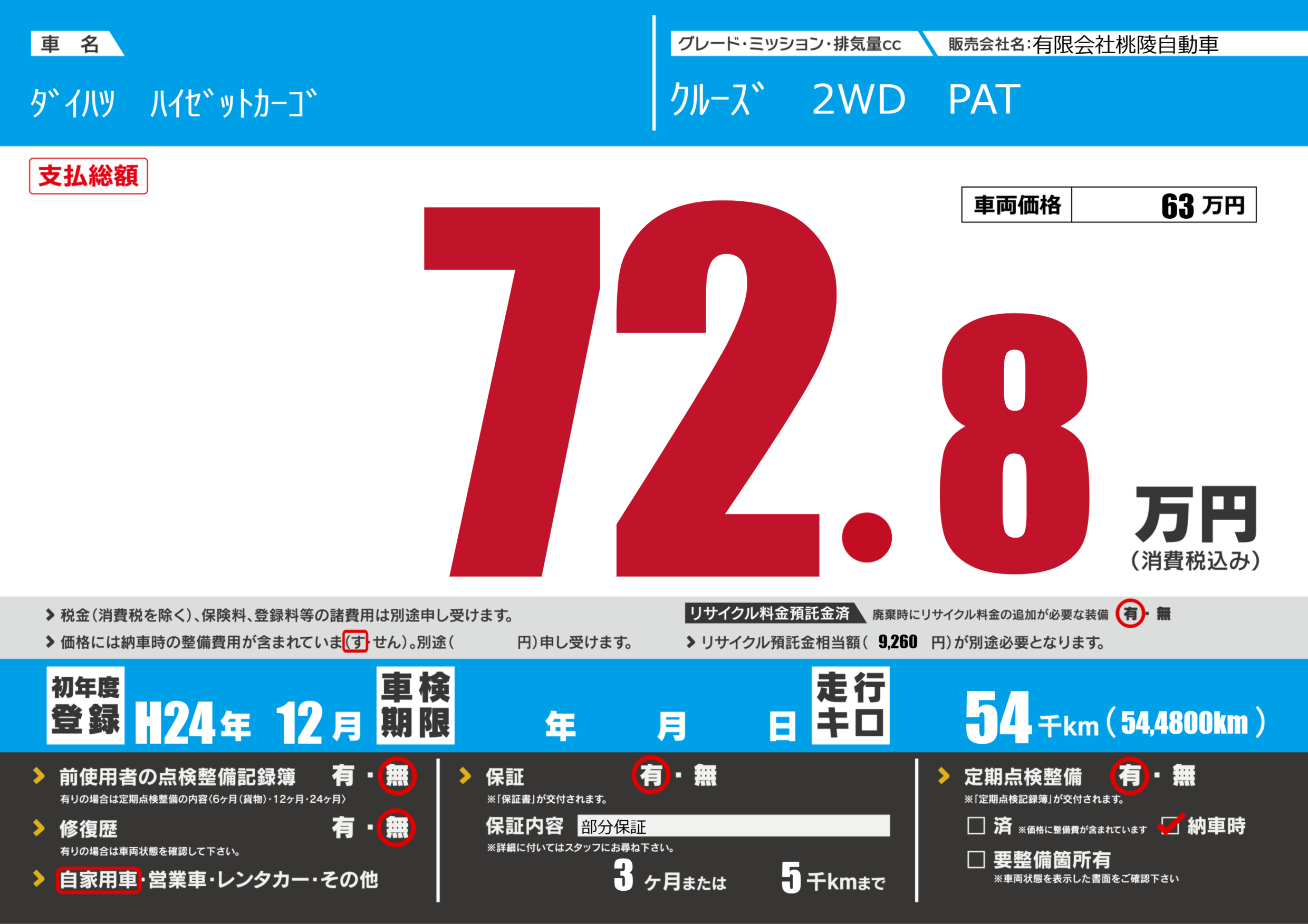 保証付き 保証内容(部分保証) 3ヶ月または(5)千kmまで |