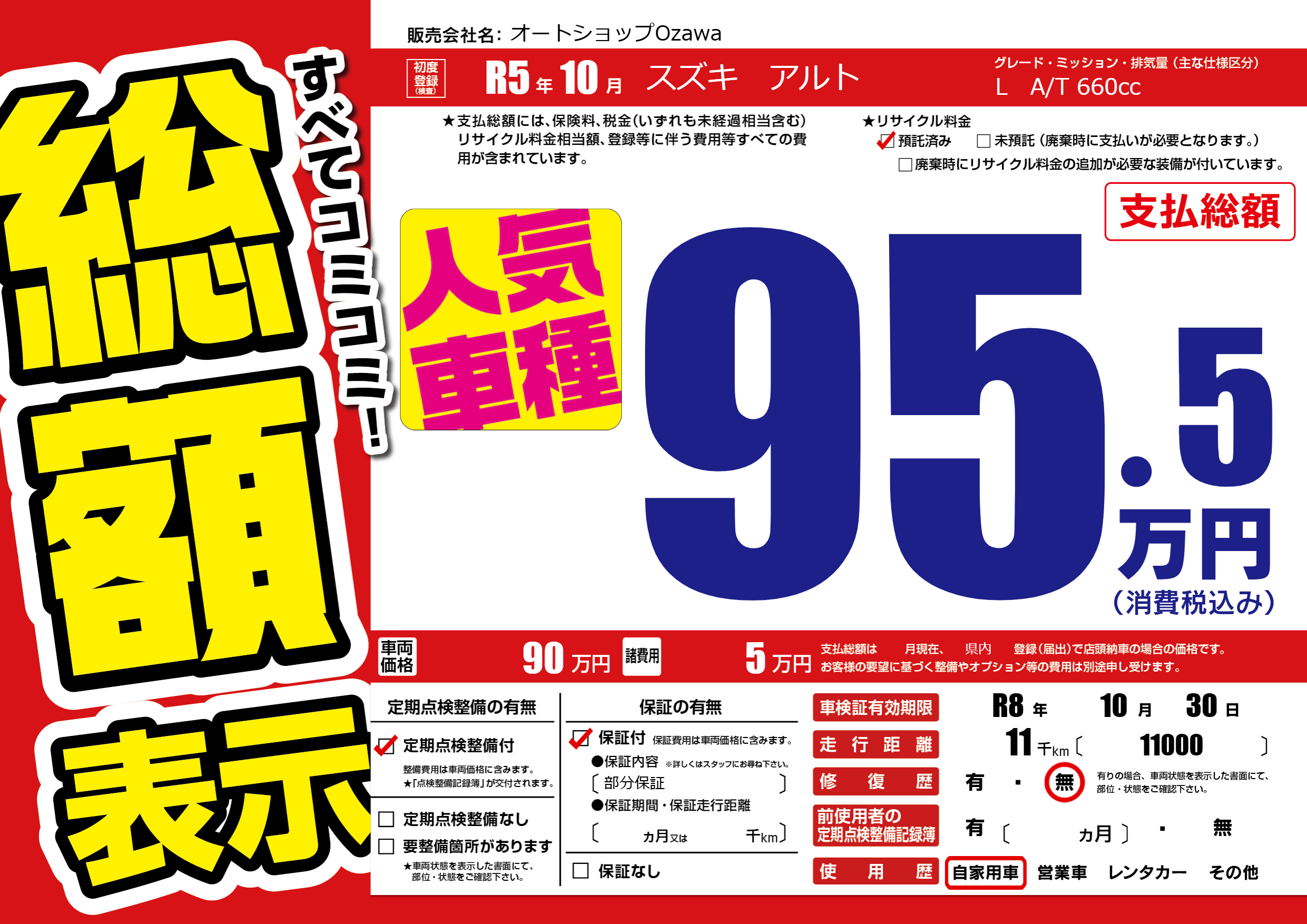 | 車名 | スズキ アルト | グレード ミッション 排気量 |
