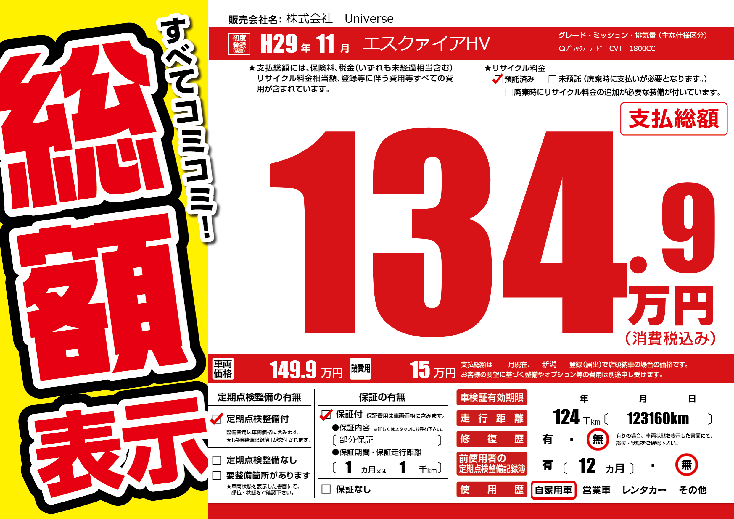 | 車名 | エスクァイアHV | グレード ミッション 排気量 |