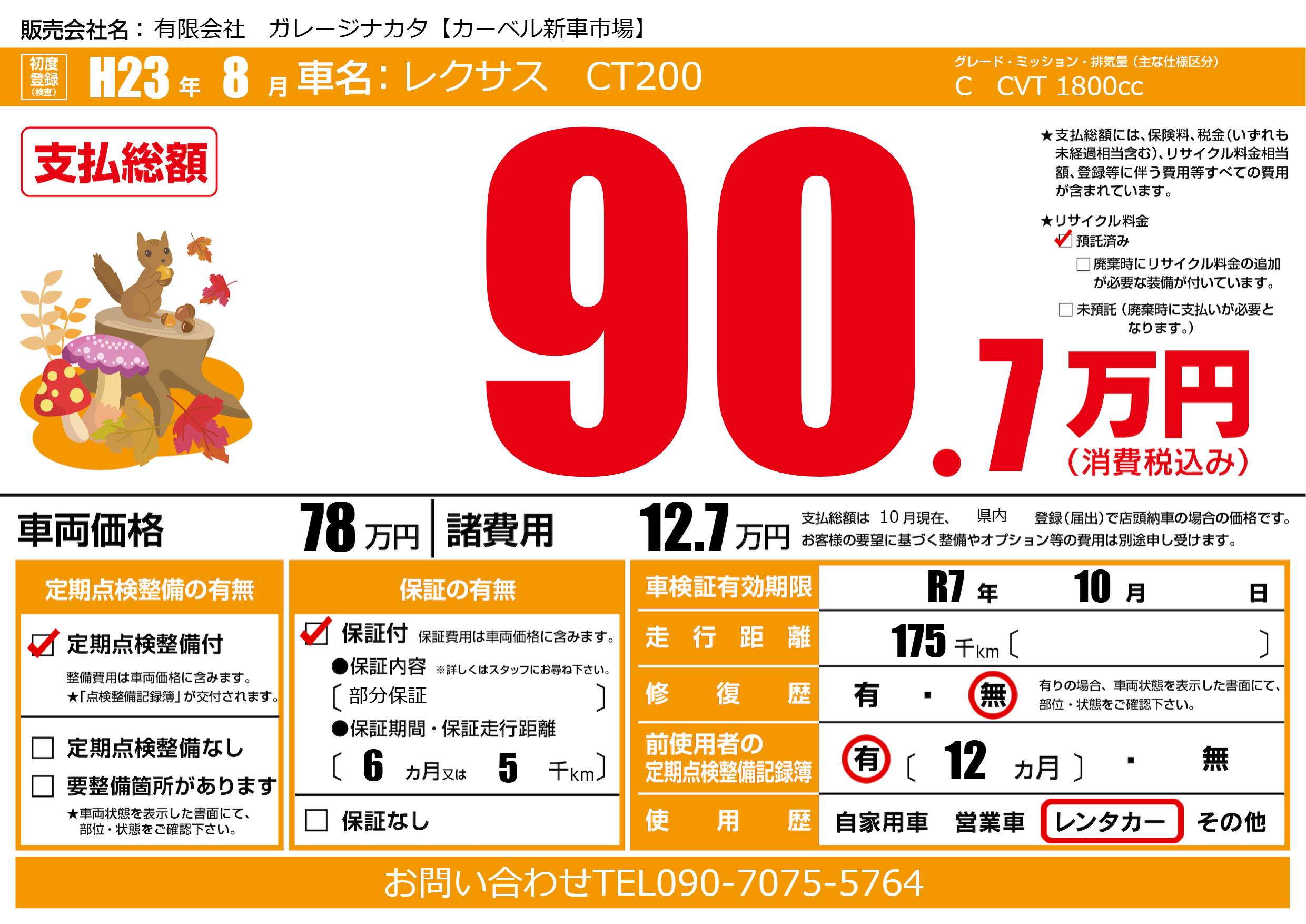 | 車検制限 | R7年 10月 - 日 | ||
