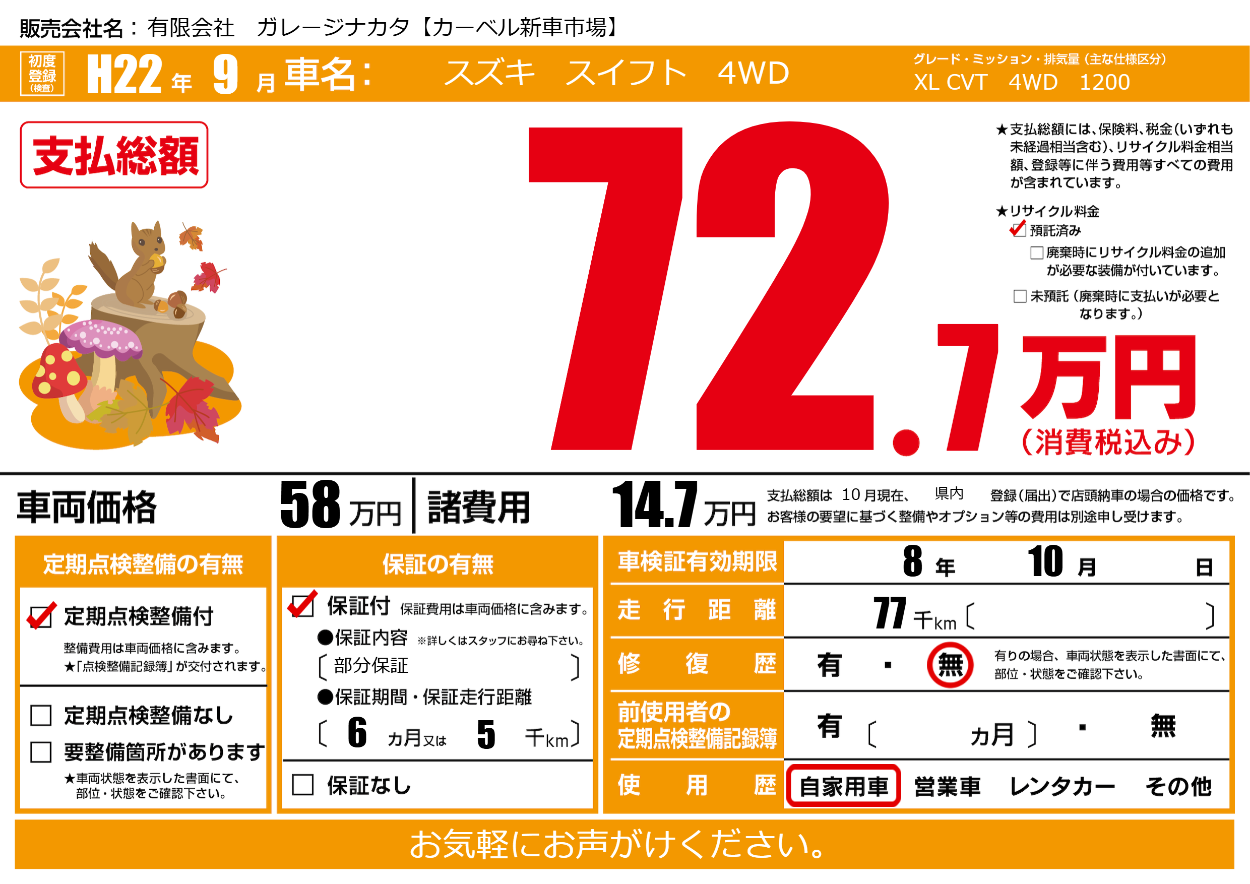 | 走行キロ | 7.7万km | 初年度登録 | H22年9月 |