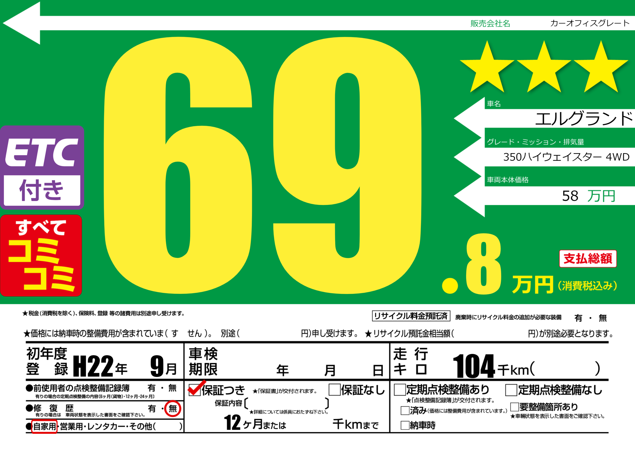 保証付き 保証内容(---) 12ヶ月または()千kmまで |