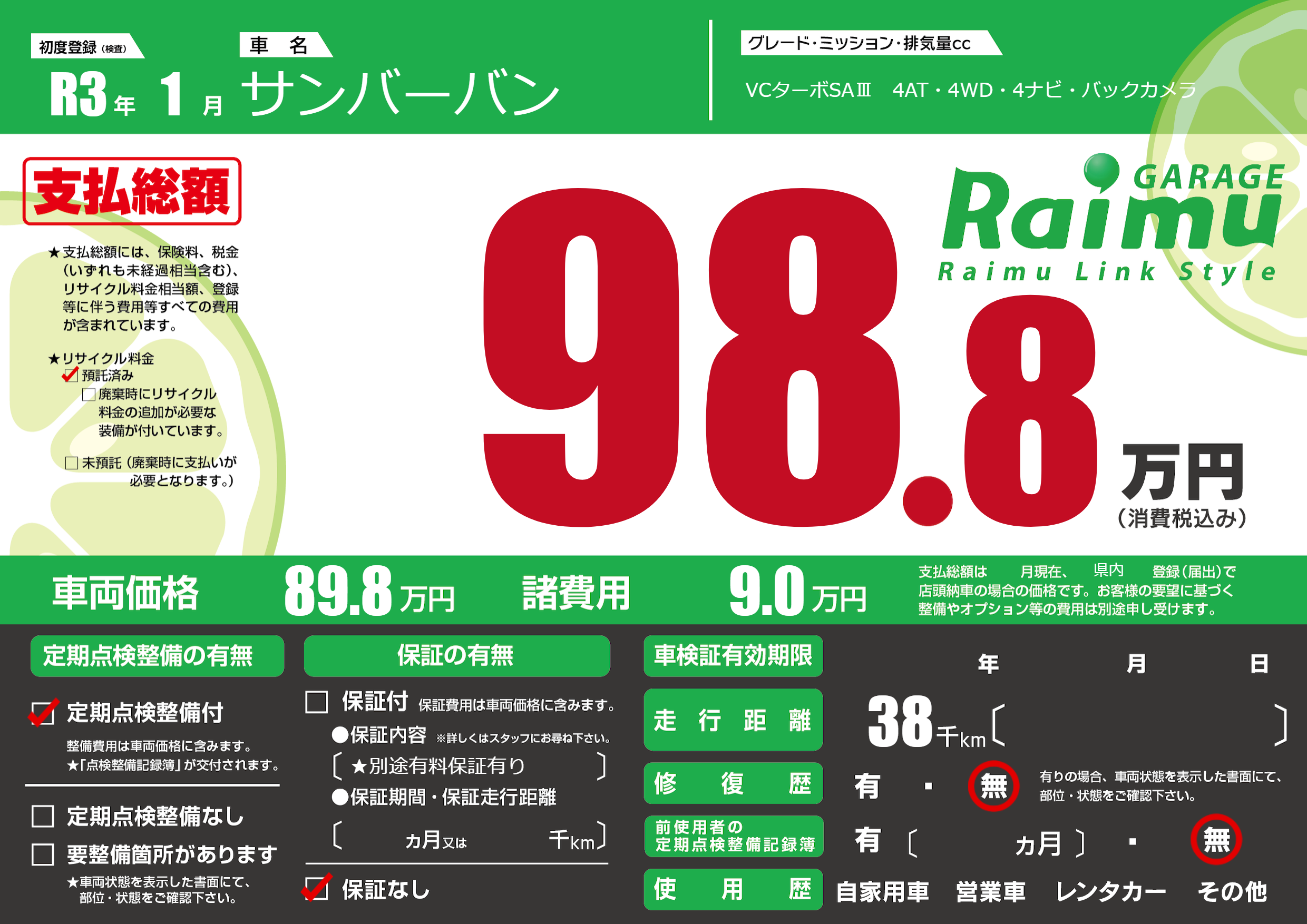 保証なし 保証内容(★別途有料保証有り) ---ヶ月または()千kmまで |