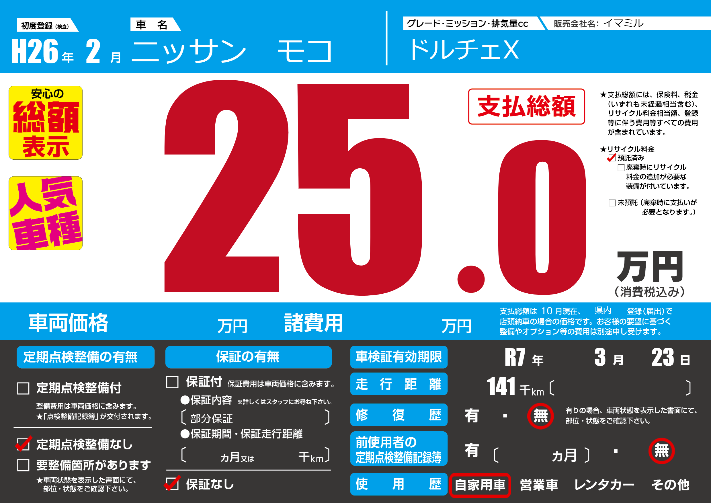| 走行キロ | 14.1万km | 初年度登録 | H26年2月 |