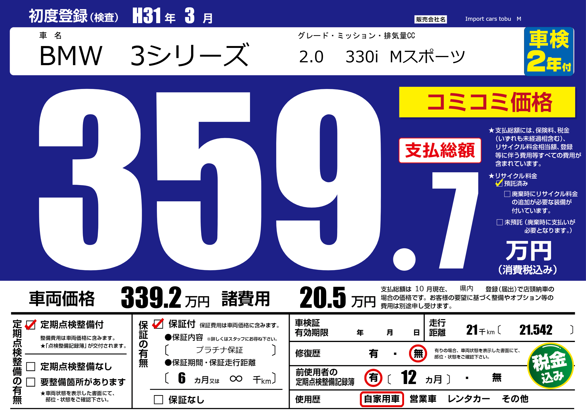 | 車名 | BMW 3シリーズ | グレード ミッション 排気量 |