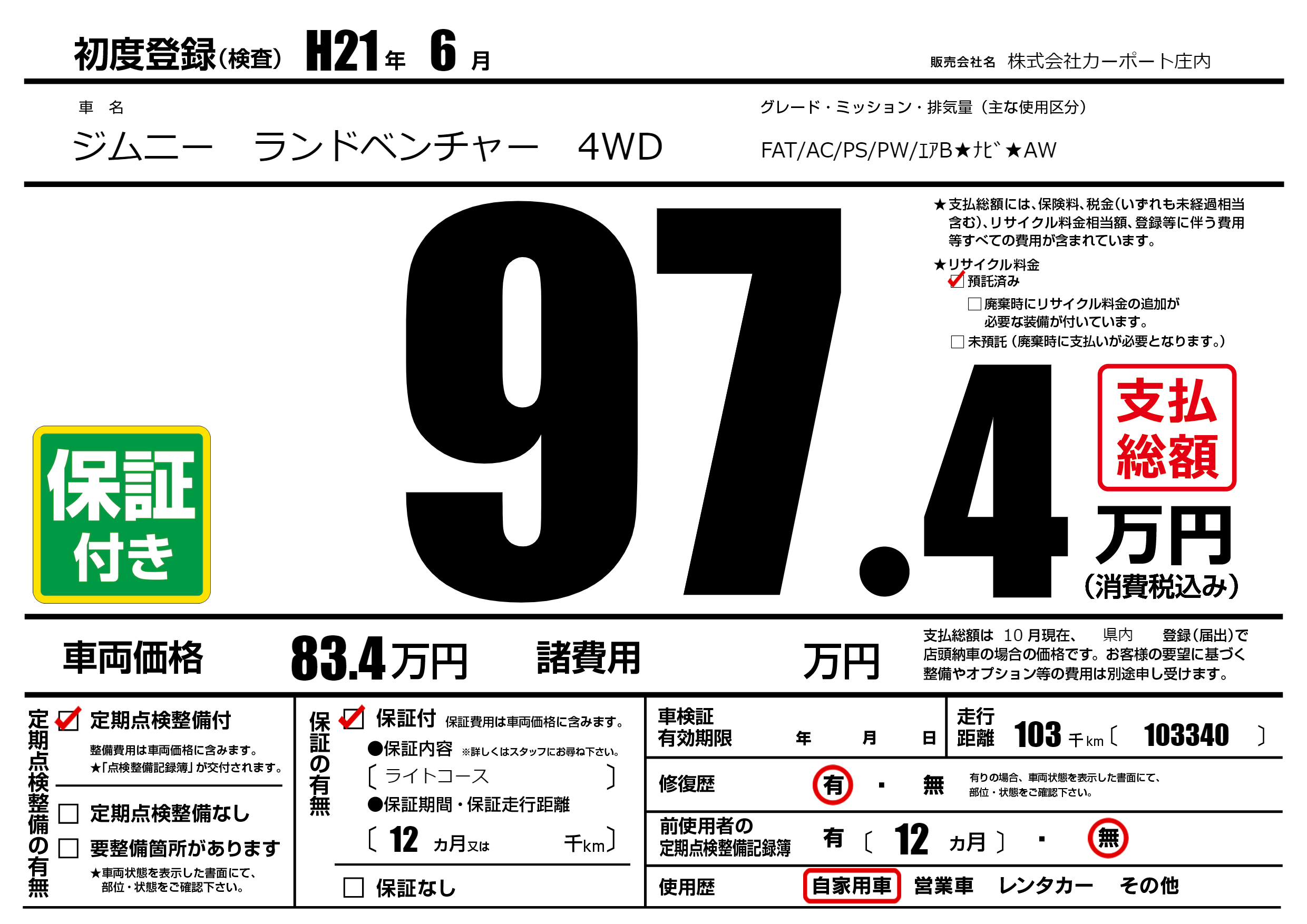 | 車名 | ジムニー ランドベンチャー 4WD | グレード ミッション 排気量 |