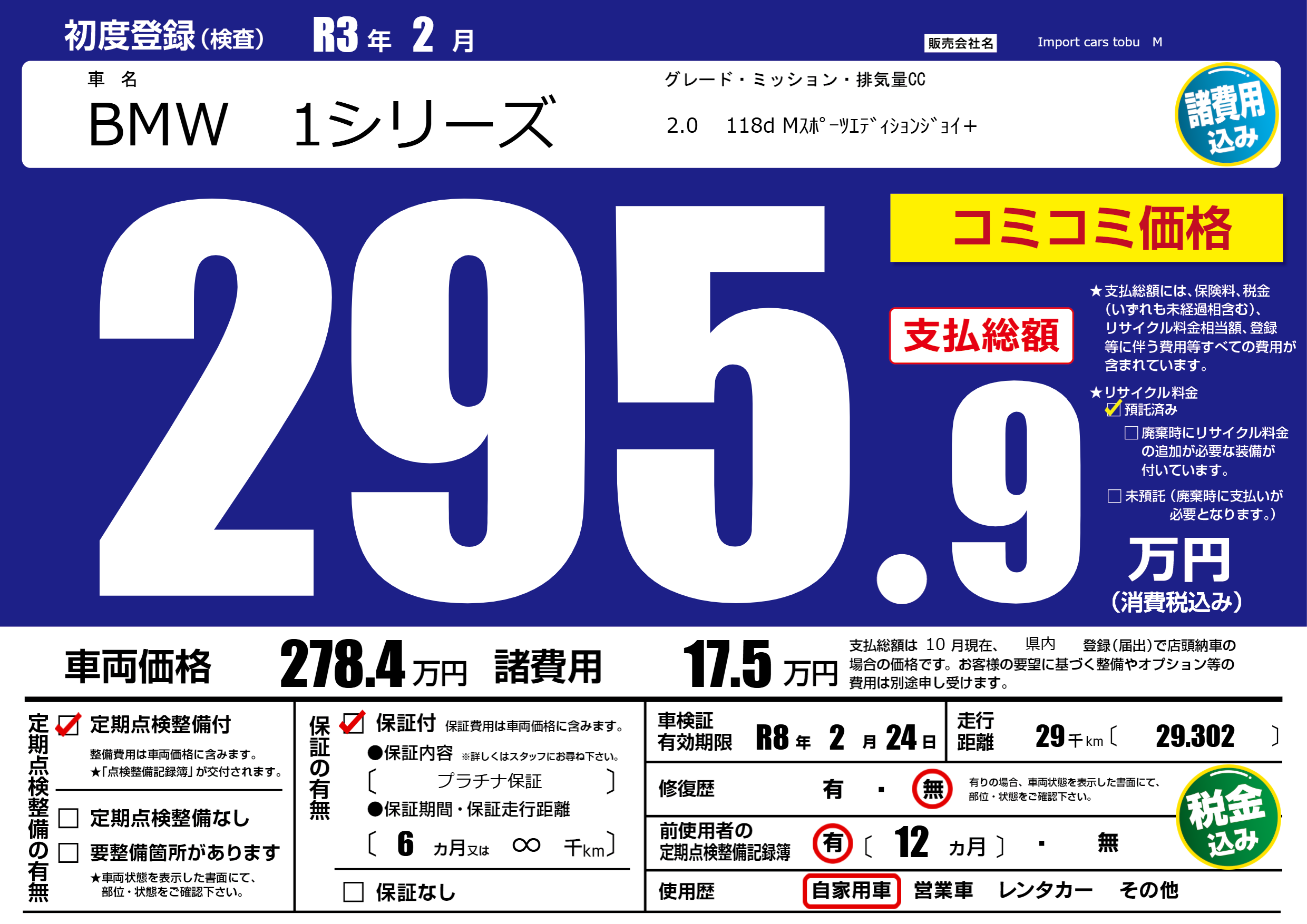 保証付き 保証内容( プラチナ保証) 6ヶ月または(∞)千kmまで |