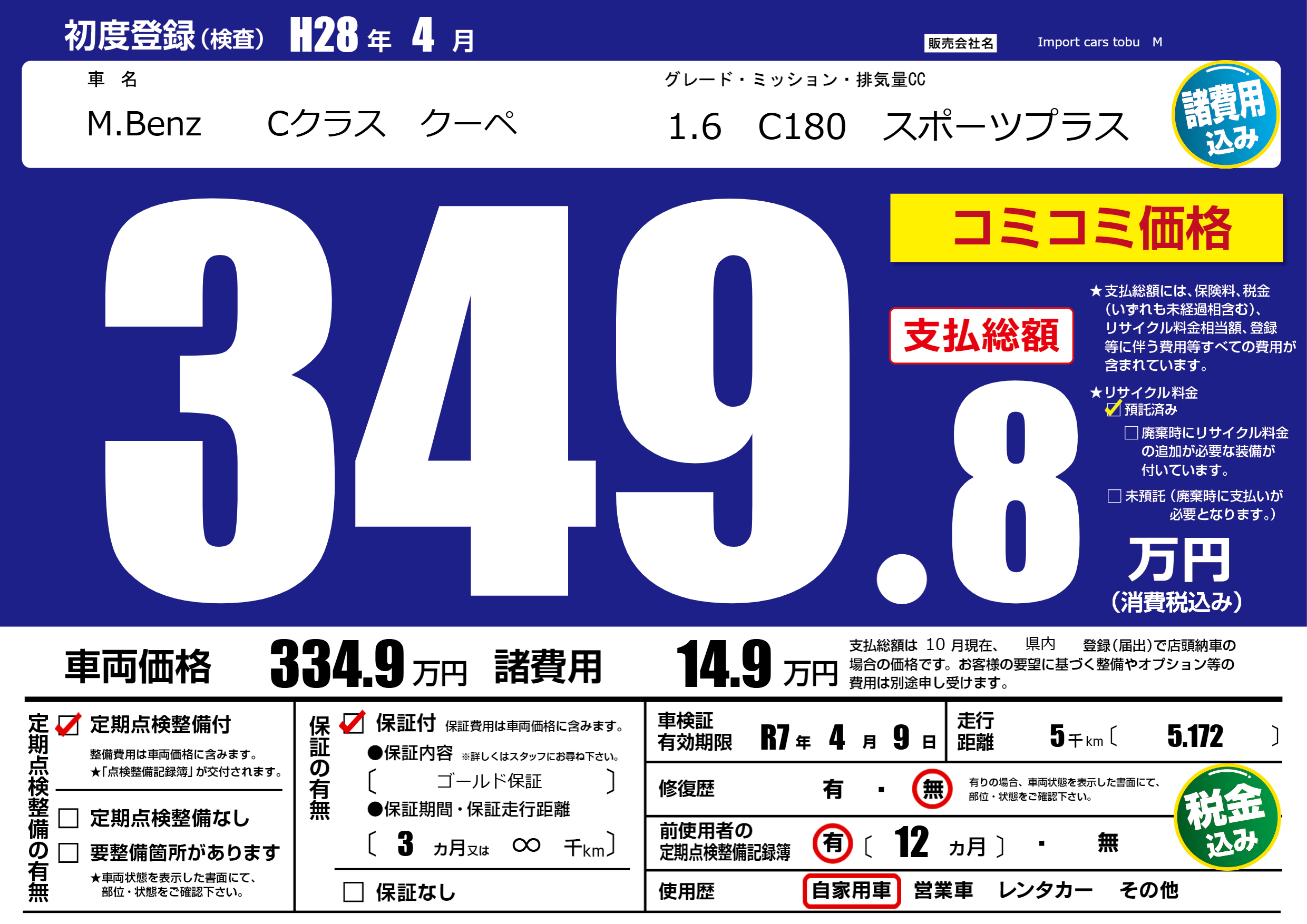 | 車名 | M.Benz Cクラス クーペ | グレード ミッション 排気量 |