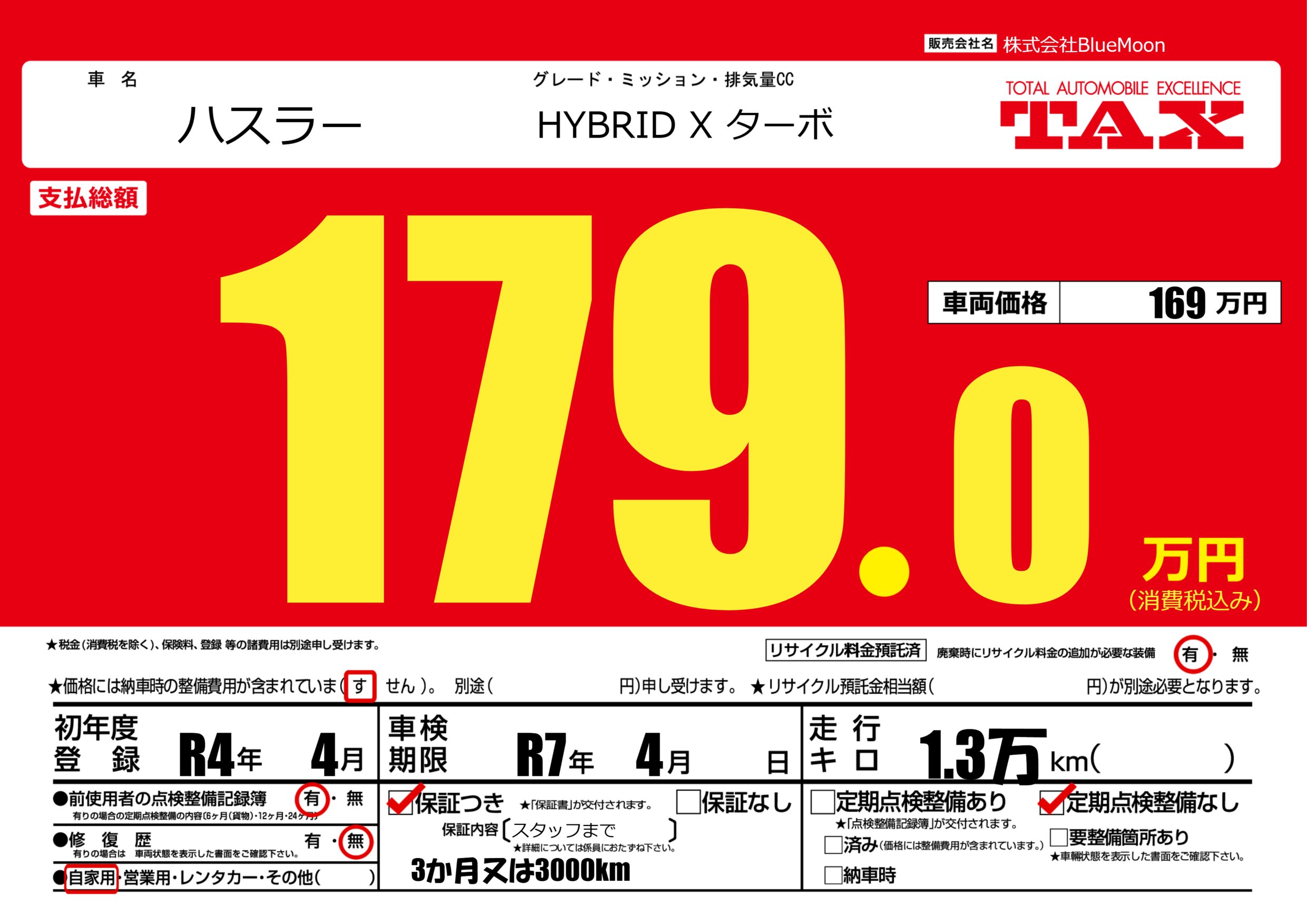 保証付き 保証内容(スタッフまで) ---ヶ月または()千kmまで |