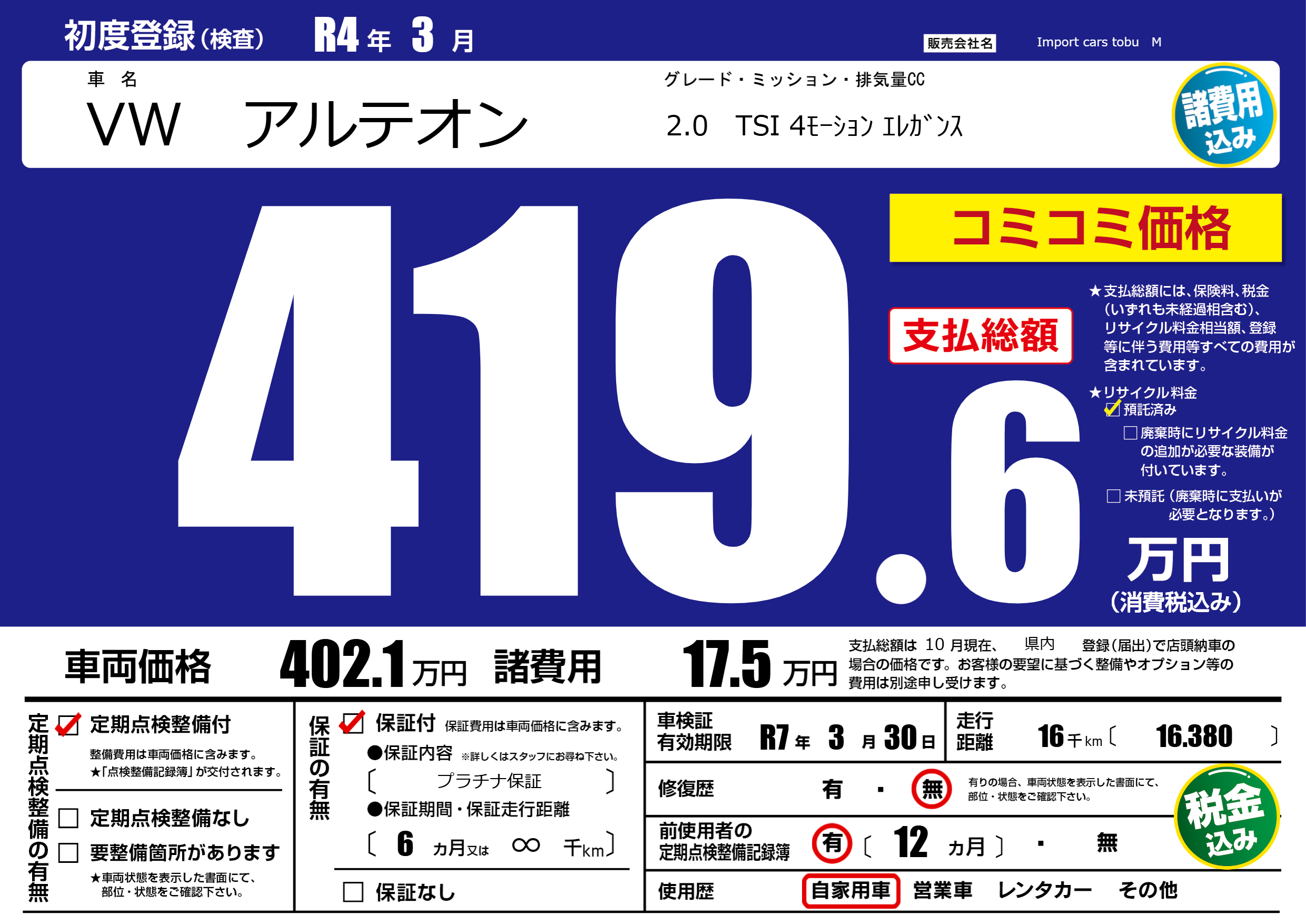 保証付き 保証内容( プラチナ保証) 6ヶ月または(∞)千kmまで |