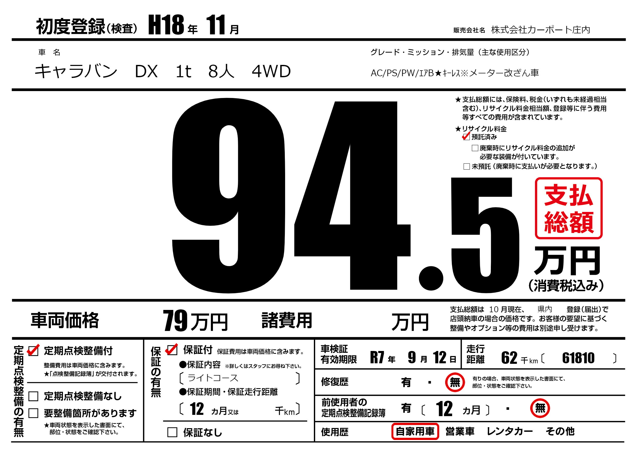 | 車名 | キャラバン DX 1t 8人 4WD | グレード ミッション 排気量 |