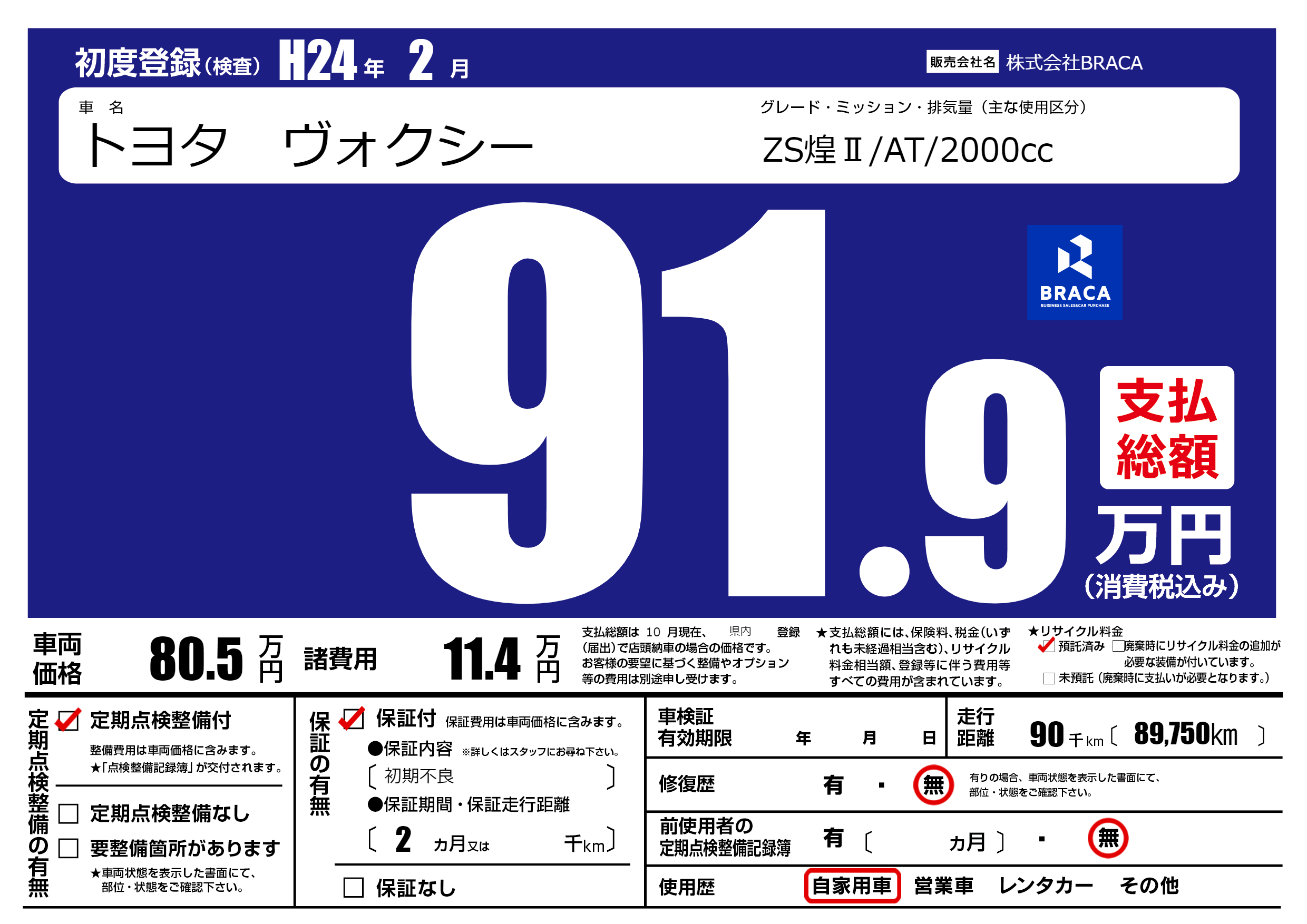 | 走行キロ | 9万km | 初年度登録 | H24年2月 |