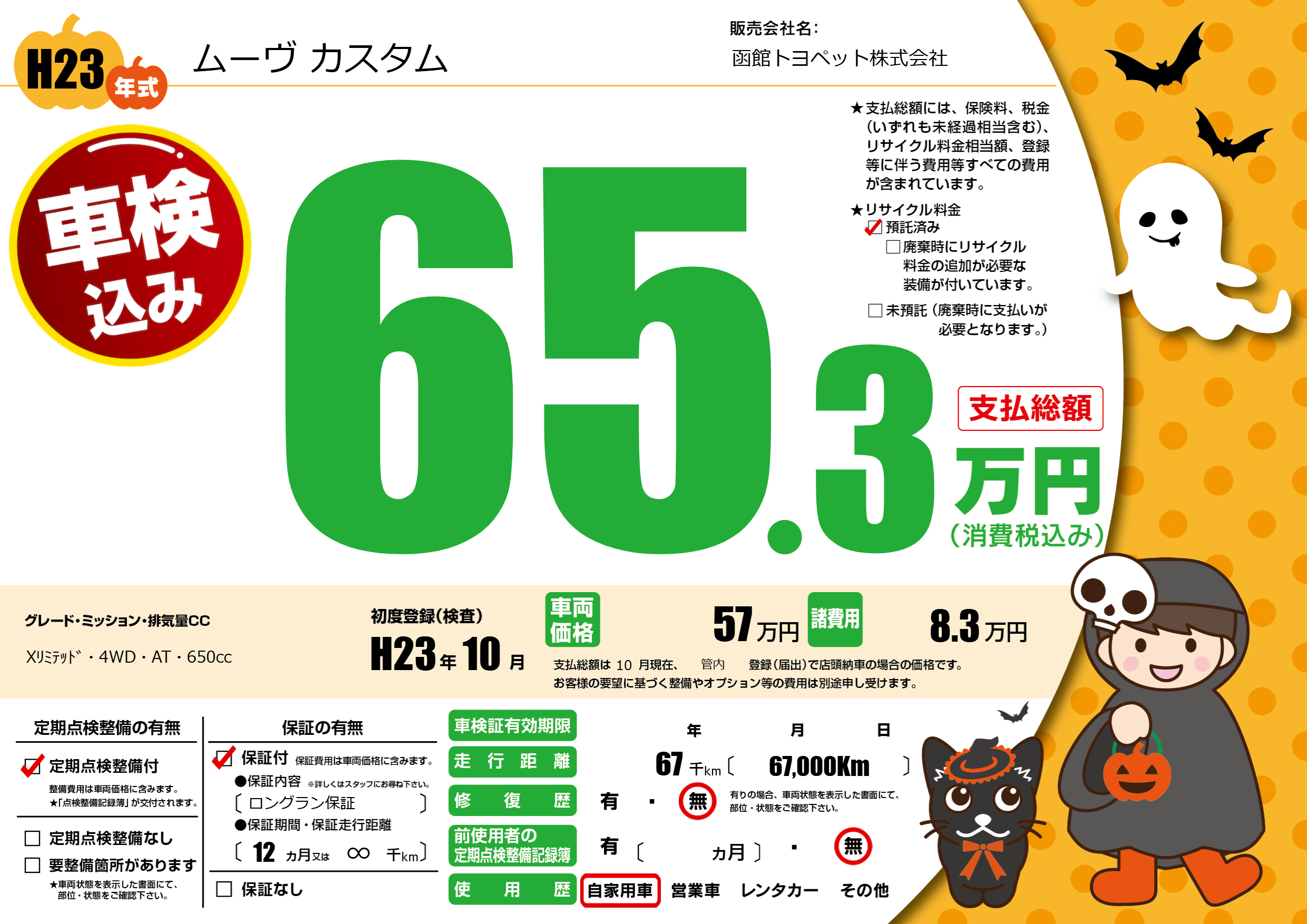 | 走行キロ | 6.7万km | 初年度登録 | H23年10月 |