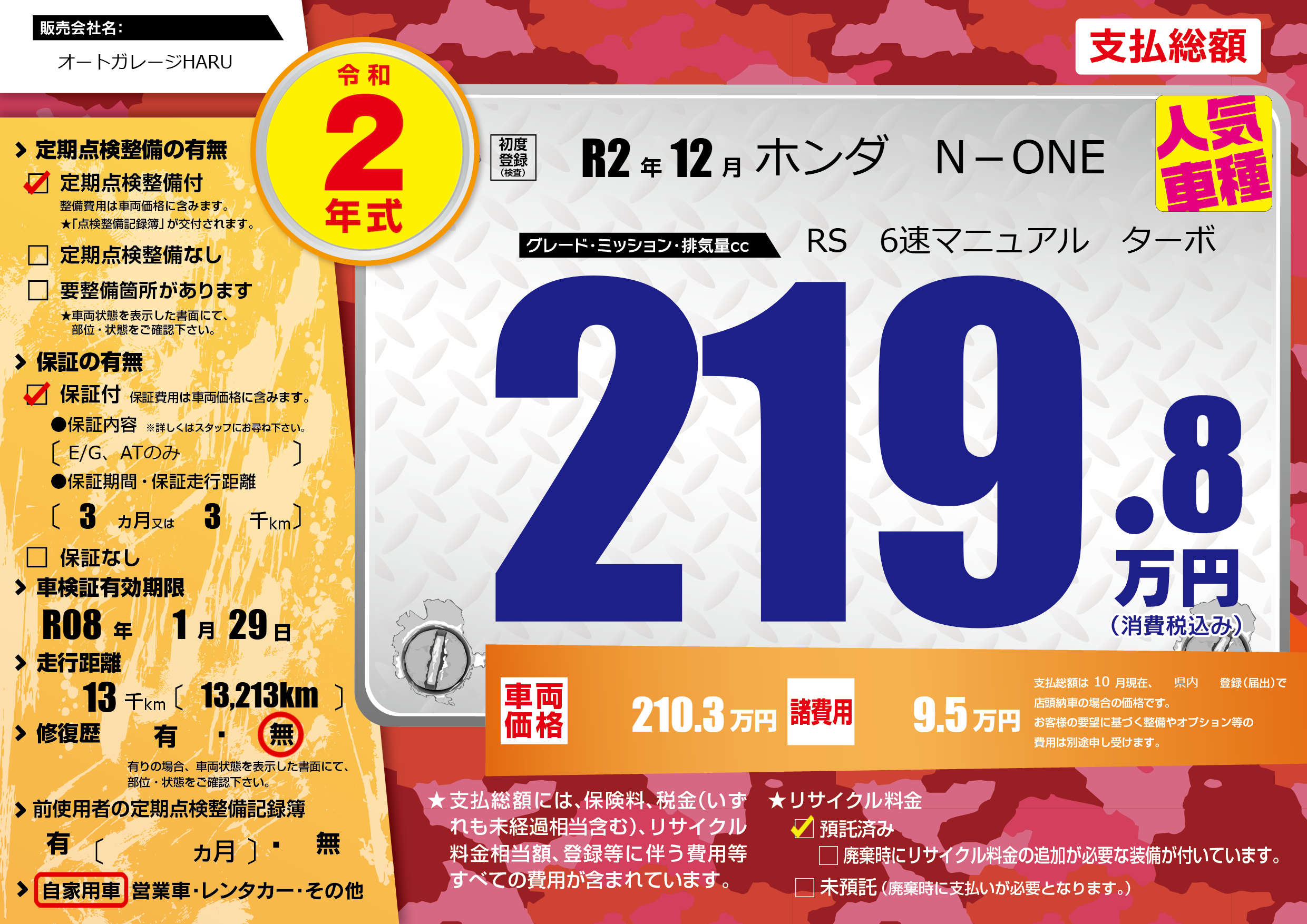 | 走行キロ | 1.3万km | 初年度登録 | R2年12月 |
