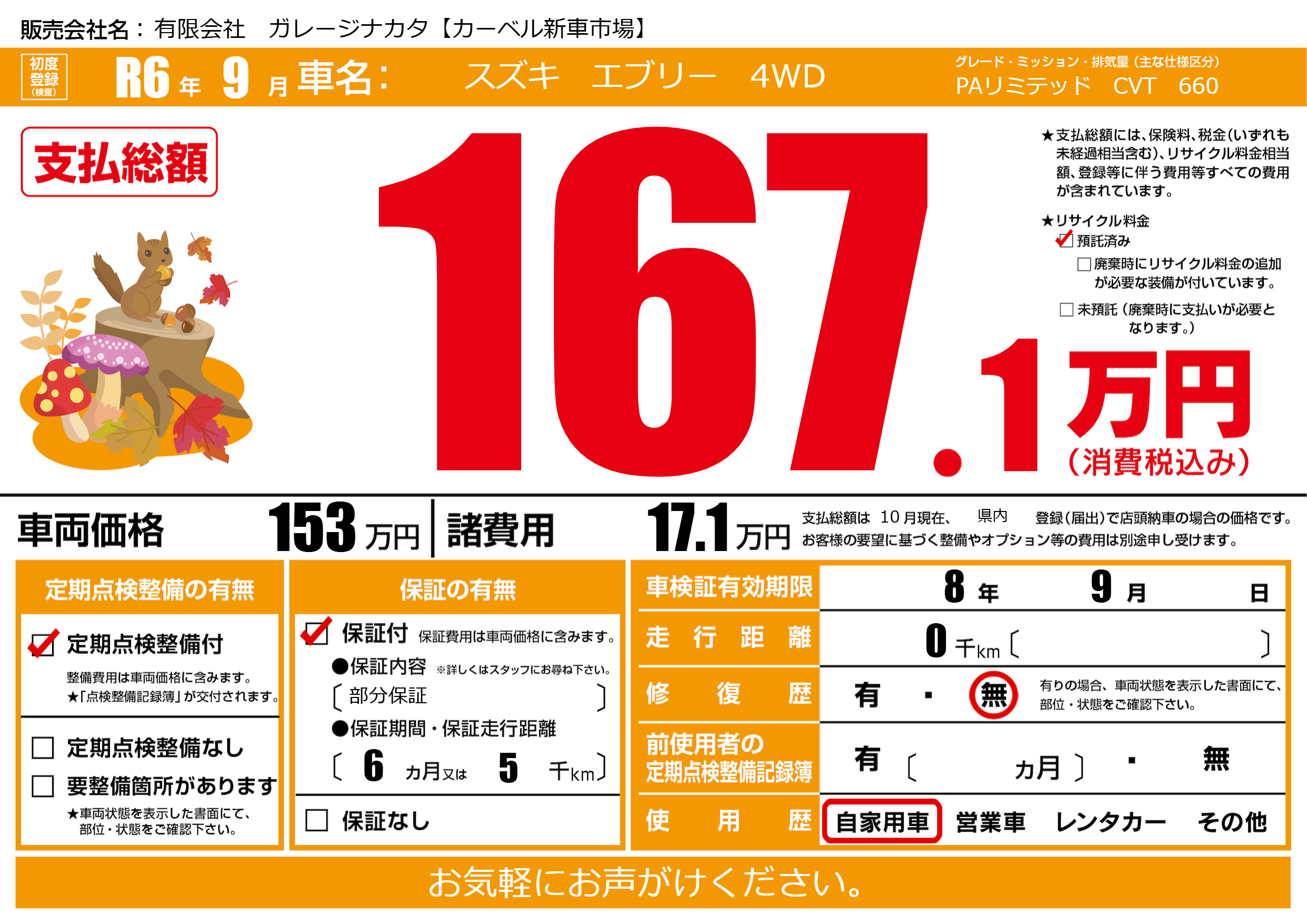 | 車名 | スズキ エブリー 4WD | グレード ミッション 排気量 |