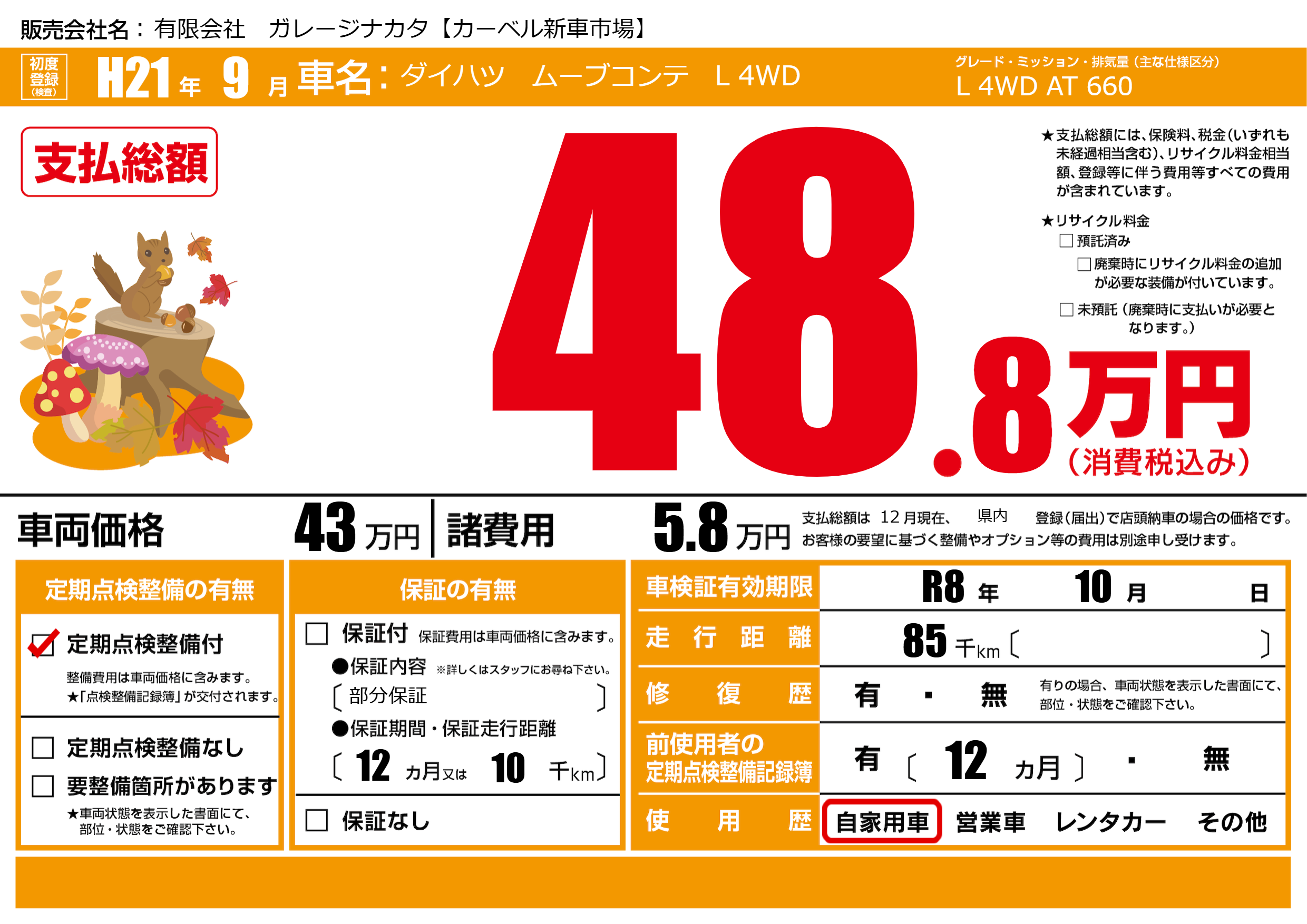 | 車名 | ダイハツ ムーブコンテ L 4WD | グレード ミッション 排気量 |