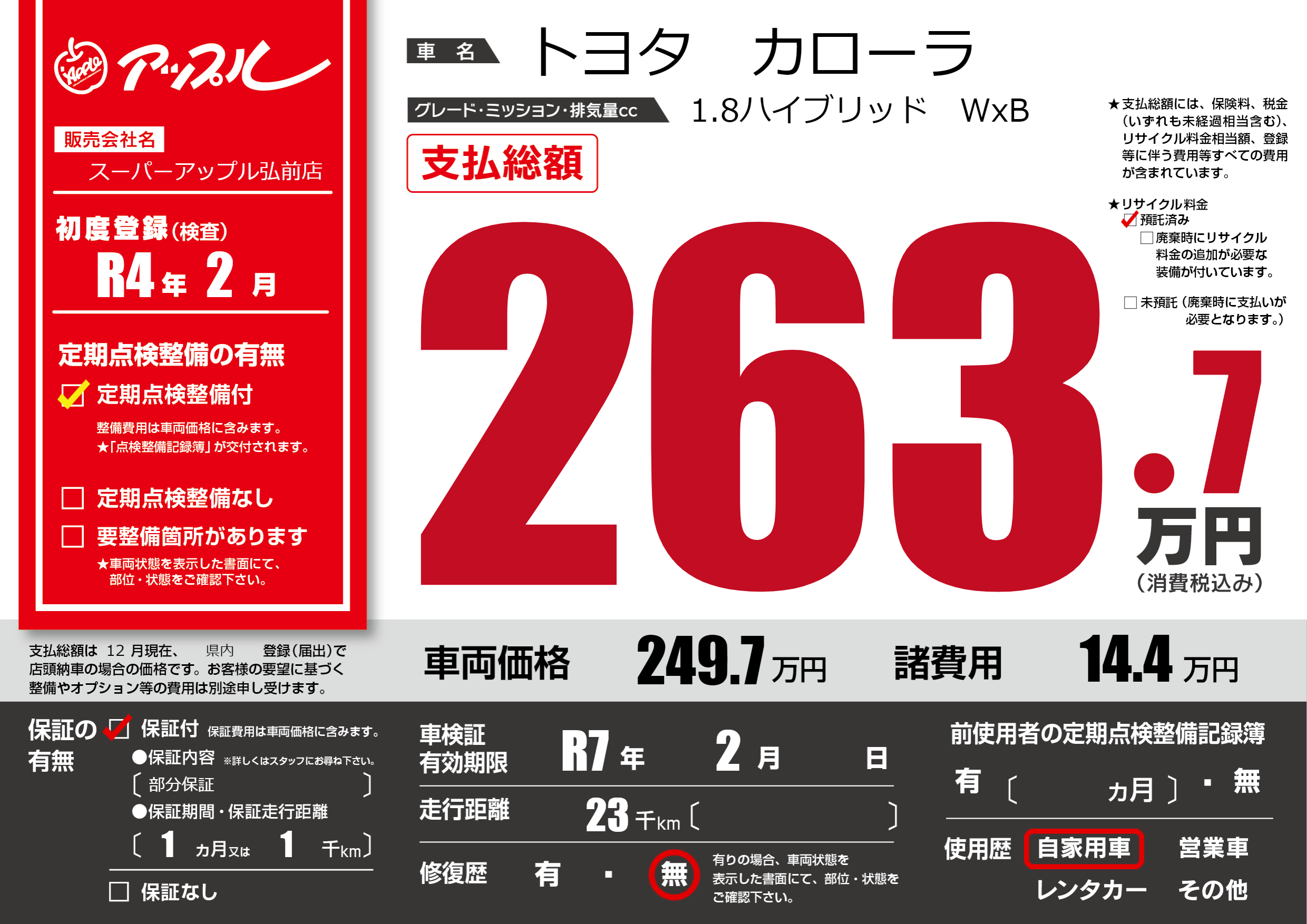 | 走行キロ | 2.3万km | 初年度登録 | R4年2月 |