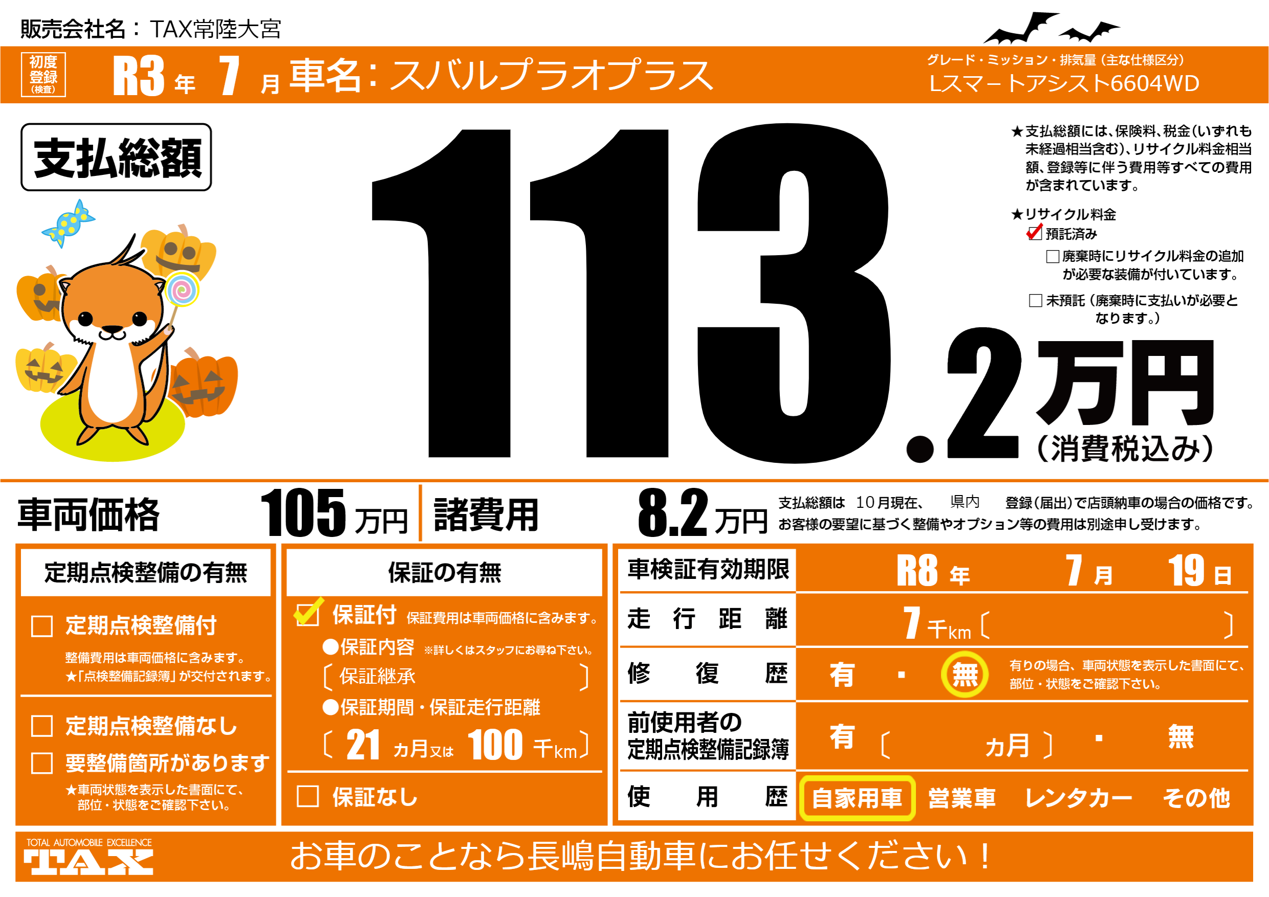 | 車検制限 | R8年 7月 19日 | ||