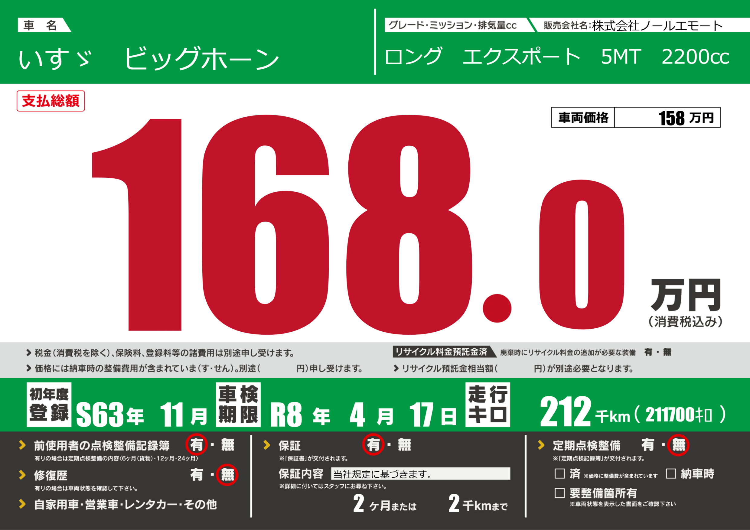 | 走行キロ | 21.2万km | 初年度登録 | S63年11月 |