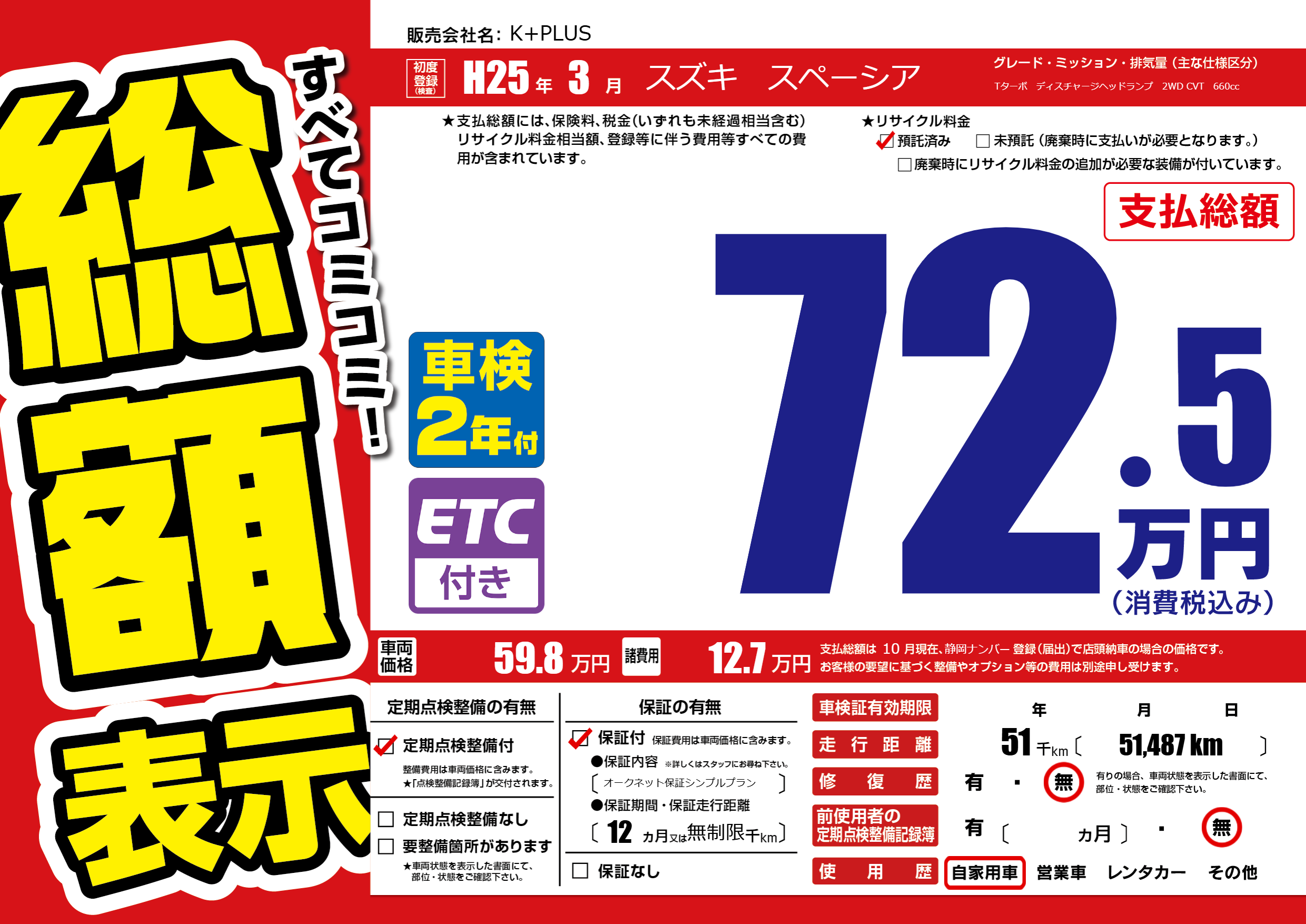 | 走行キロ | 5.1万km | 初年度登録 | H25年3月 |