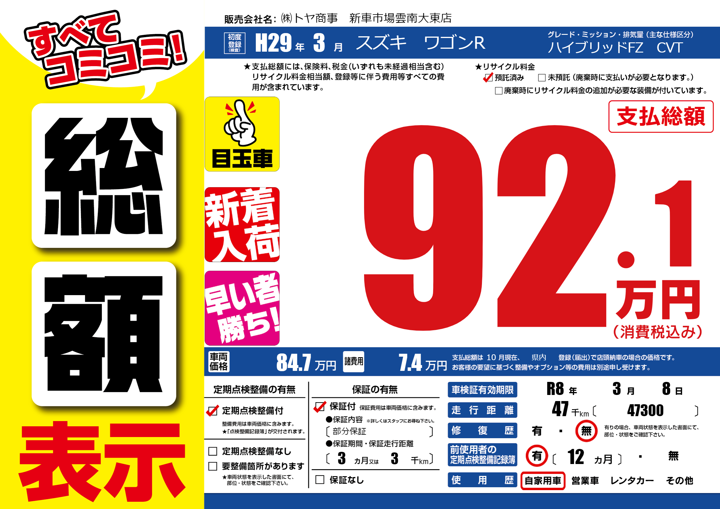 | 車名 | スズキ ワゴンR | グレード ミッション 排気量 |