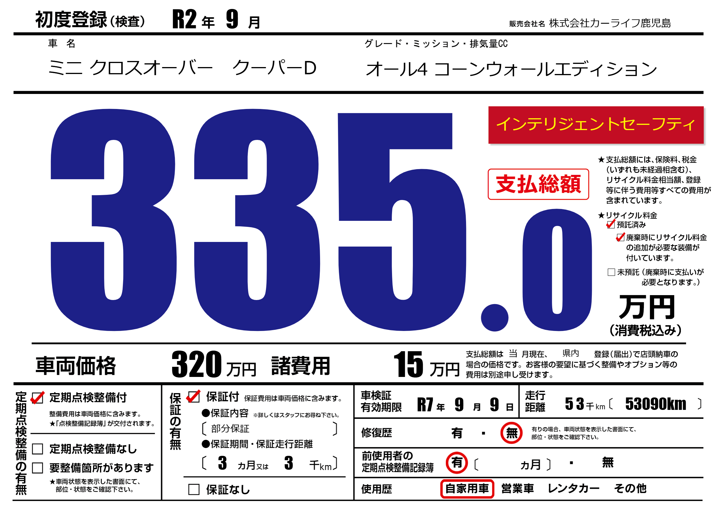 | 走行キロ | 0.5万km | 初年度登録 | R2年9月 |