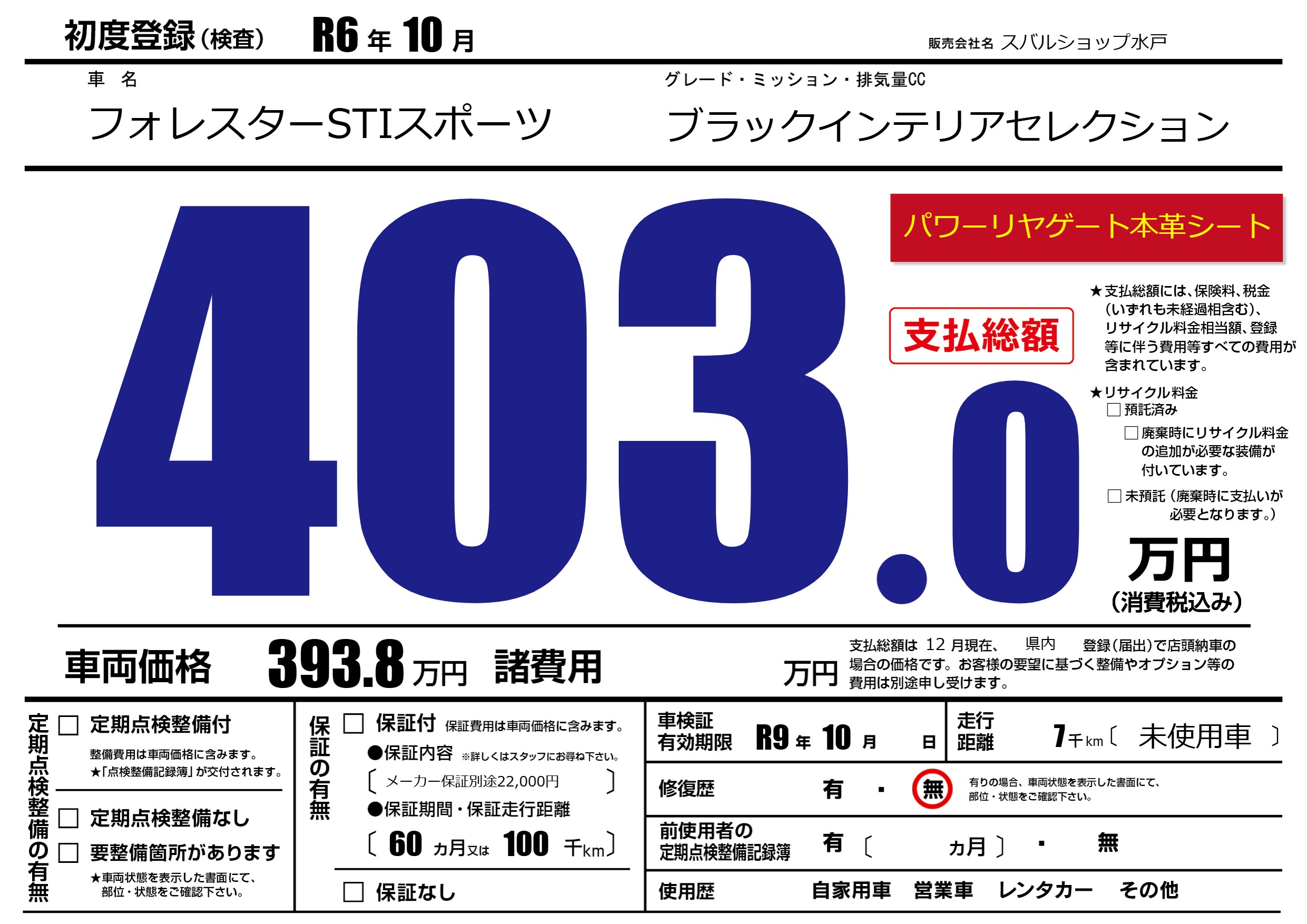 | 車名 | フォレスターSTIスポーツ | グレード ミッション 排気量 |