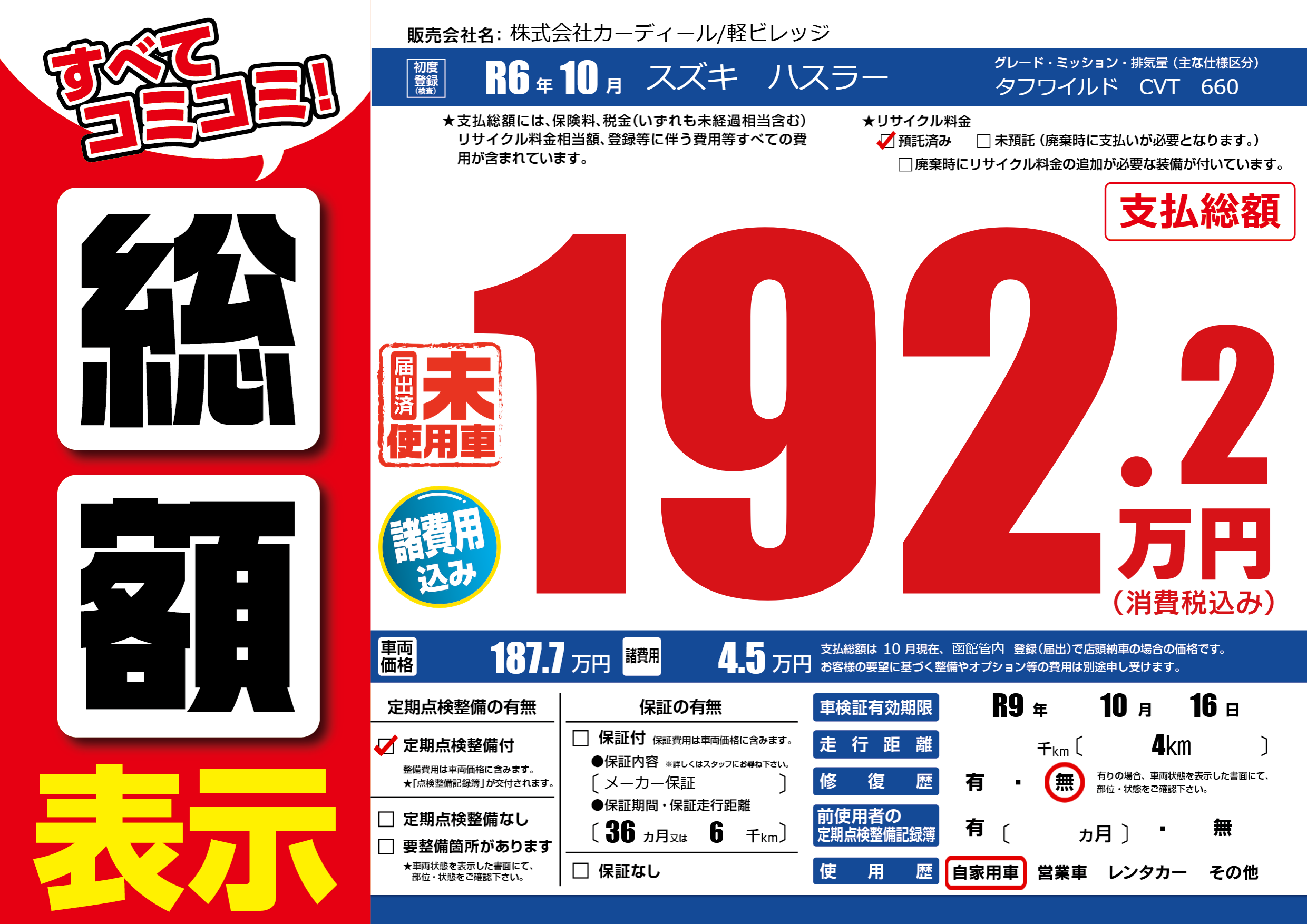 | 車名 | スズキ ハスラー | グレード ミッション 排気量 |