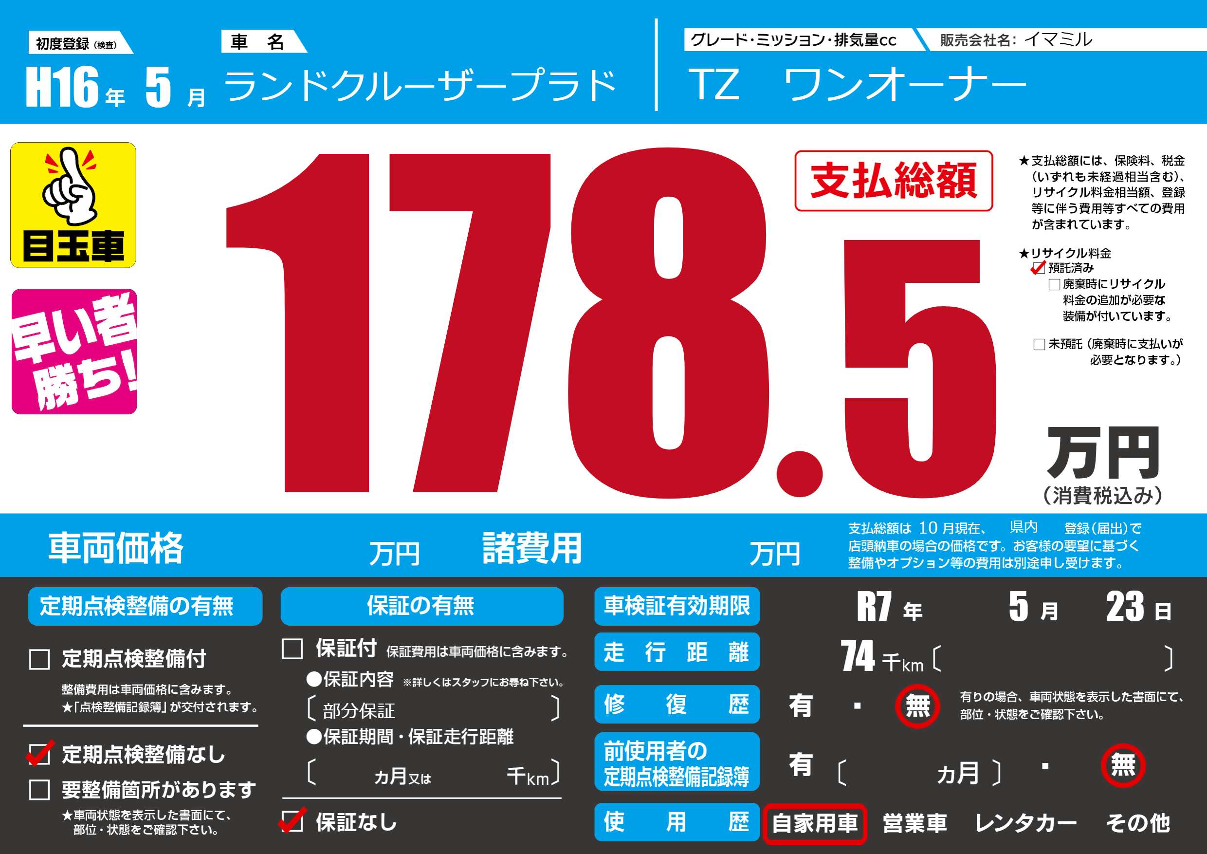 | 走行キロ | 7.4万km | 初年度登録 | H16年5月 |