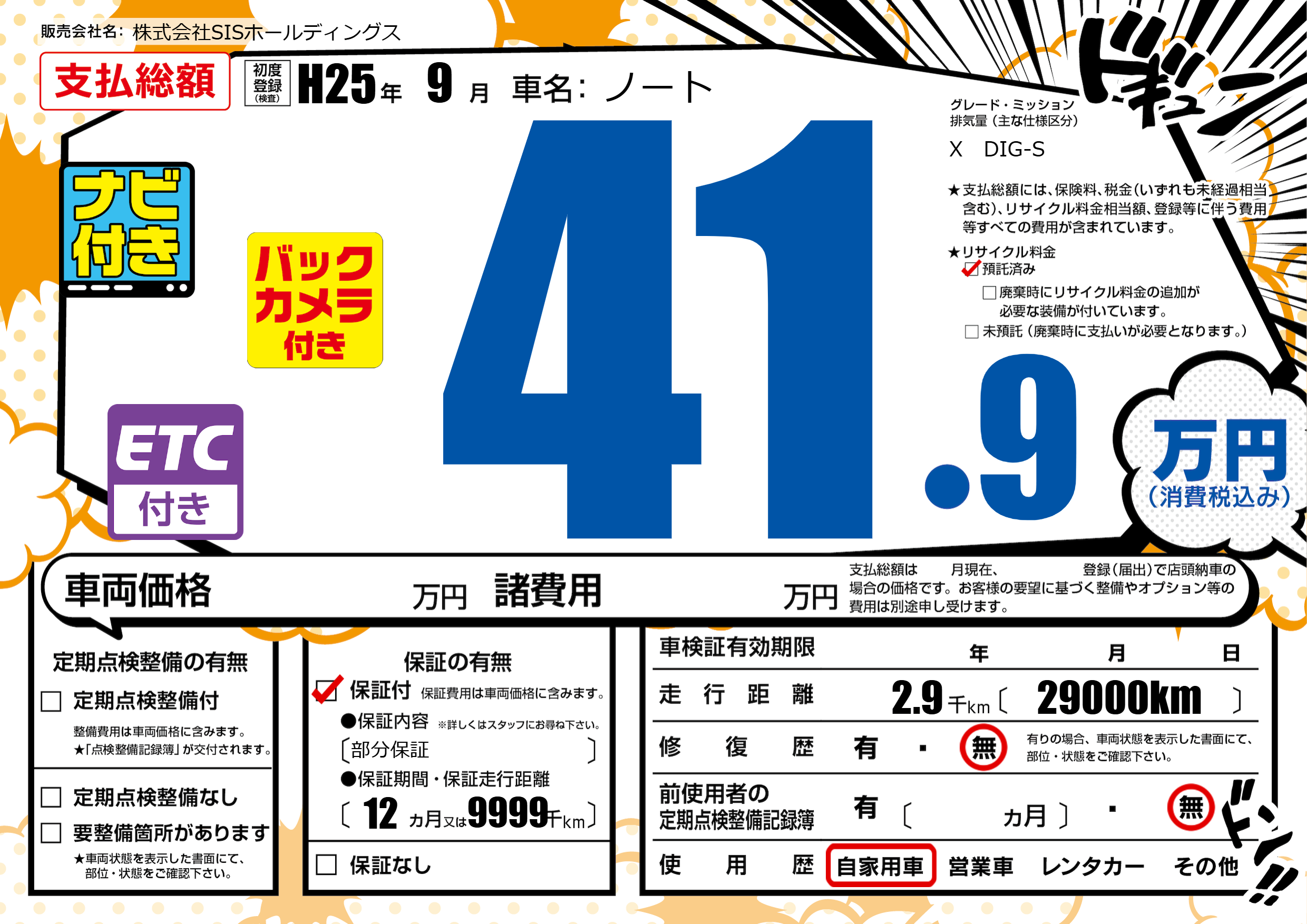 | 走行キロ | 0.2万km | 初年度登録 | H25年9月 |