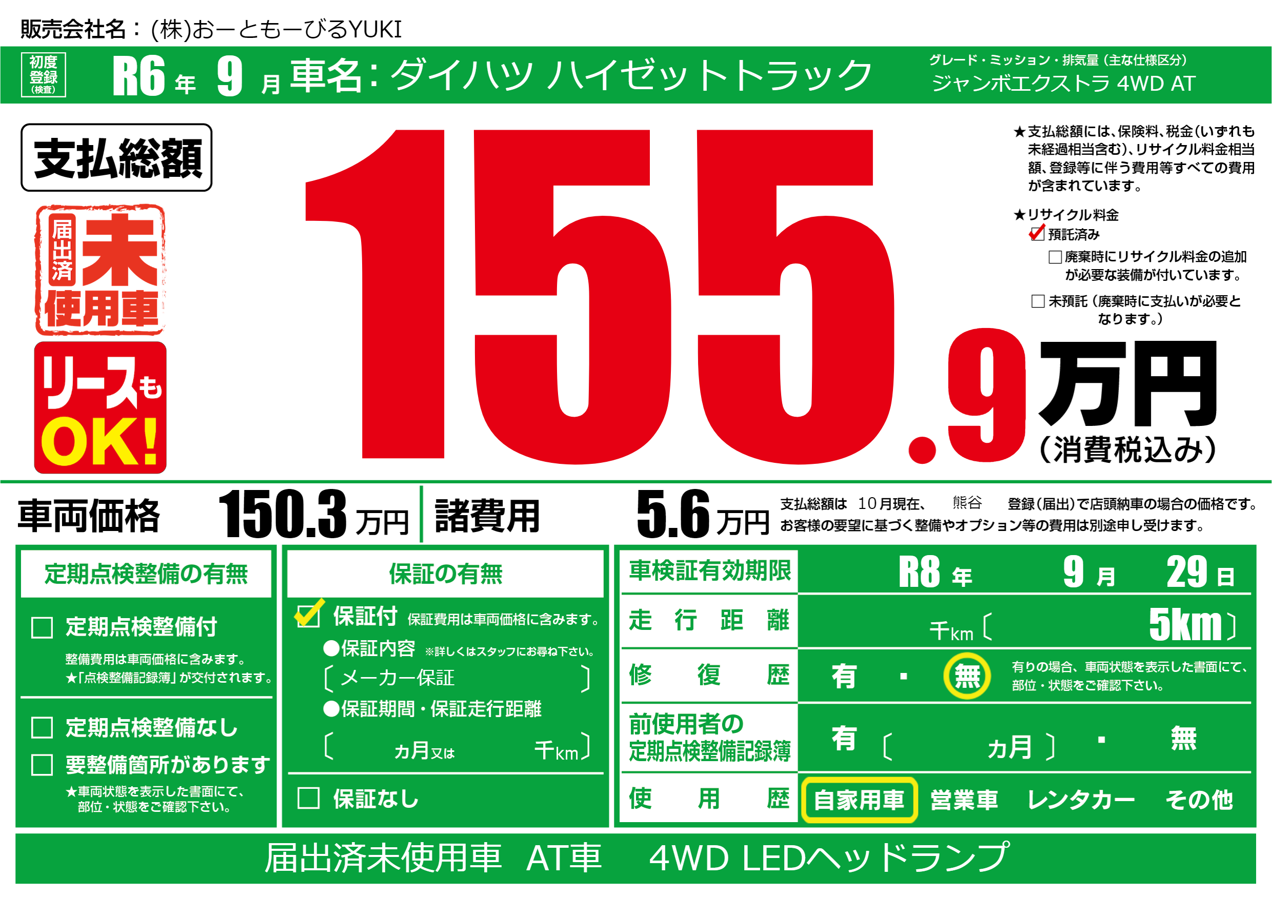 | 走行キロ | - | 初年度登録 | R6年9月 |